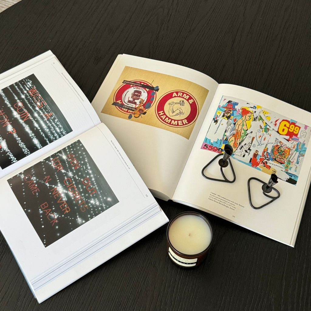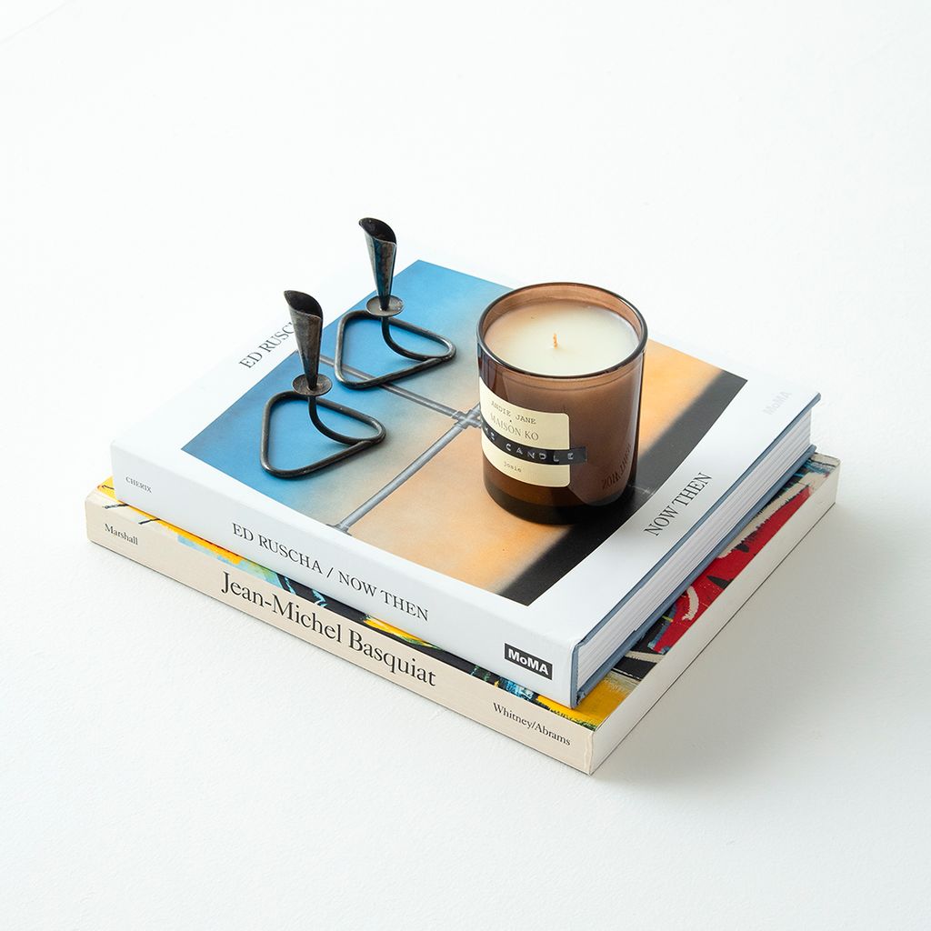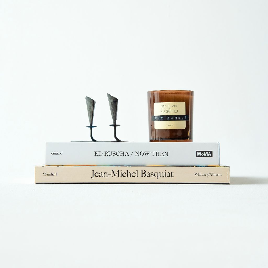 Color Story features Vintage Jean-Michel Basquiat and Whitney/Abrams Book, New 'Ed Ruscha / Now Then: A Retrospective' Book, Vintage Brass Candle Holders, and Andie Jane x Maison Ko 'josie Candle with. notes of iris, bergamot, and vanilla.