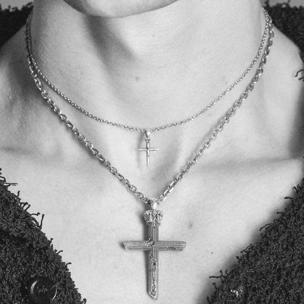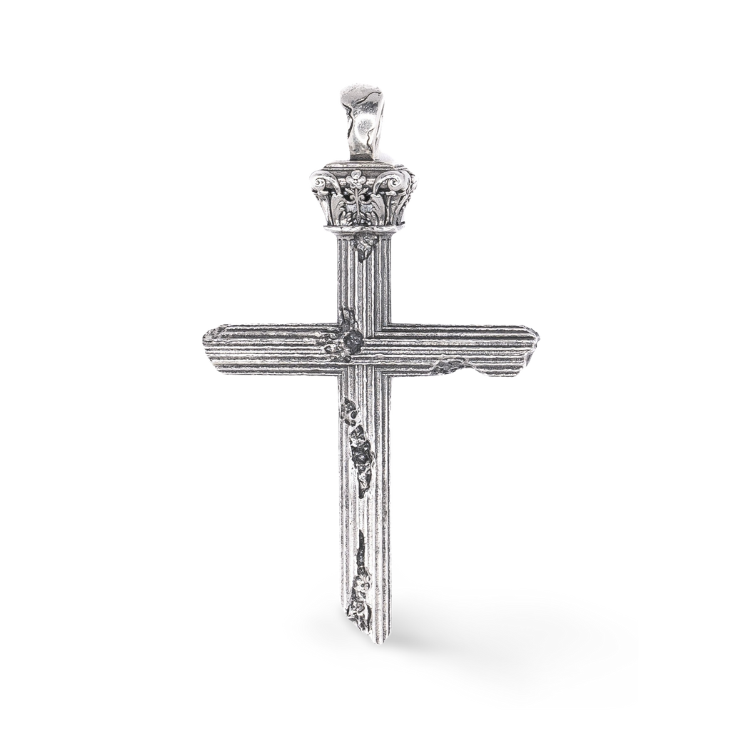 A finely detailed, ancient columned crucifix in Sterling Silver. Pair with a matching Chapel Chain.