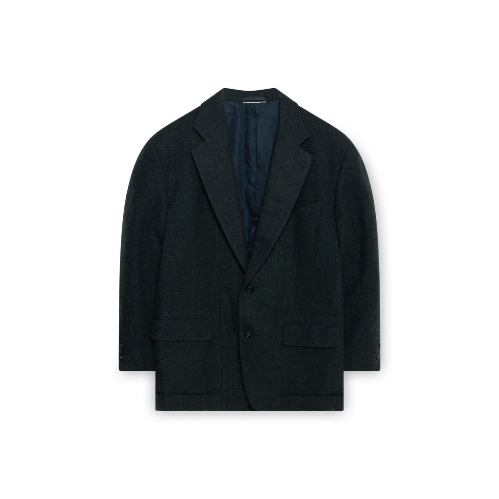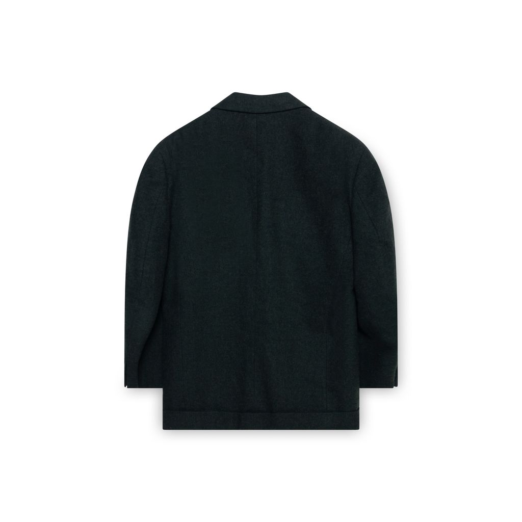 Comme Des Garcons Dark Green Wool Blazer features slanted chest pocket, 2 front pockets, front button closure, and shoulder pads.
