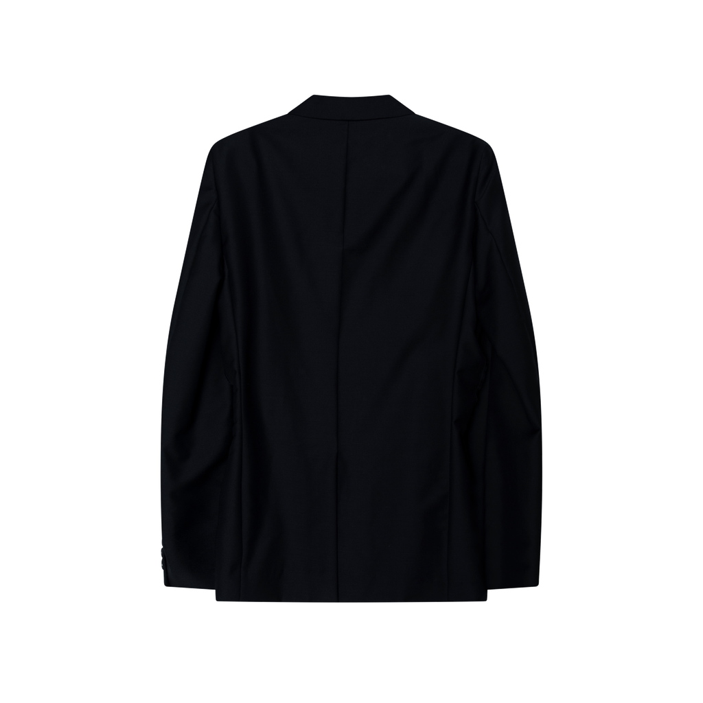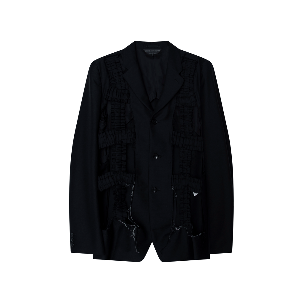 Comme des Garcons Homme Plus Ruched Cut Out Blazer features ruched cut out design on front, front button closure, and back vent.