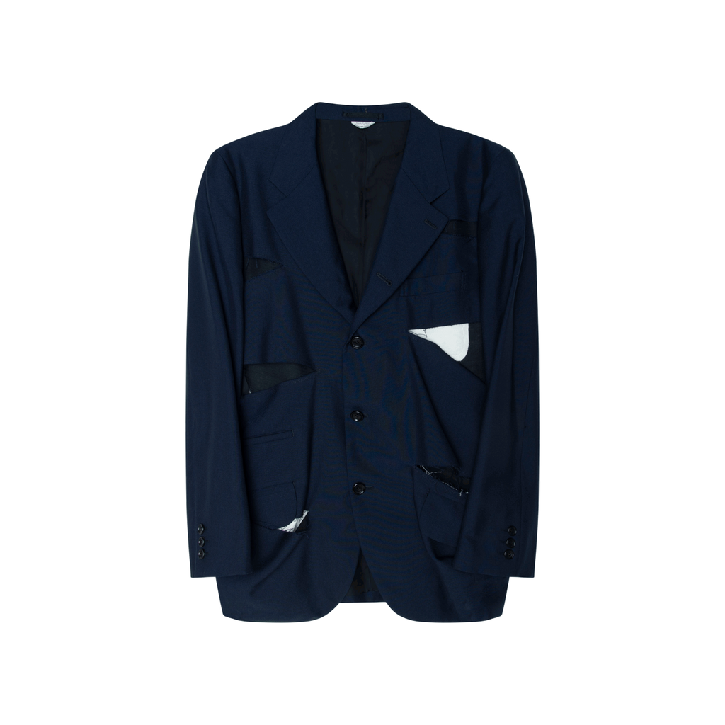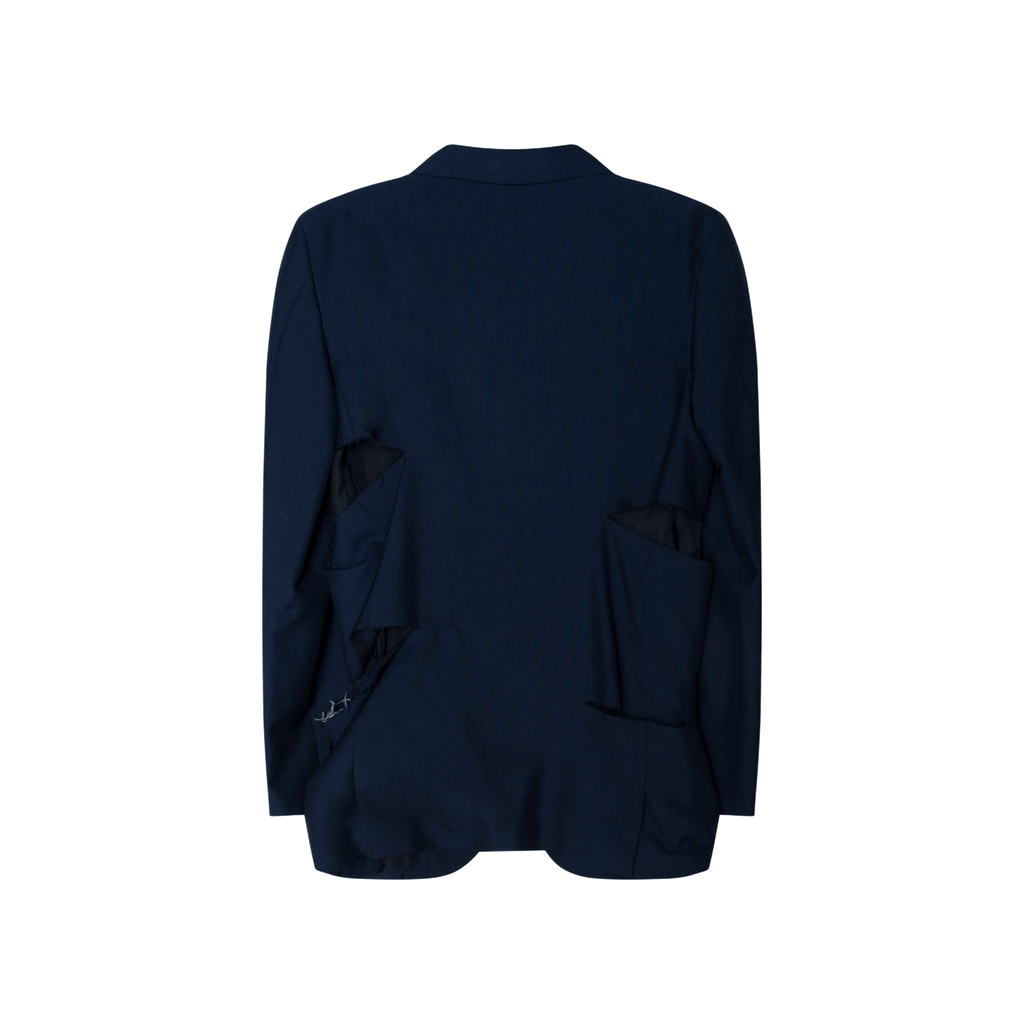 Comme des Garcons Navy Slashed Blazer features 4 pocket styling, front button closure, and slashed design on sides.