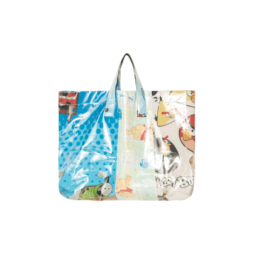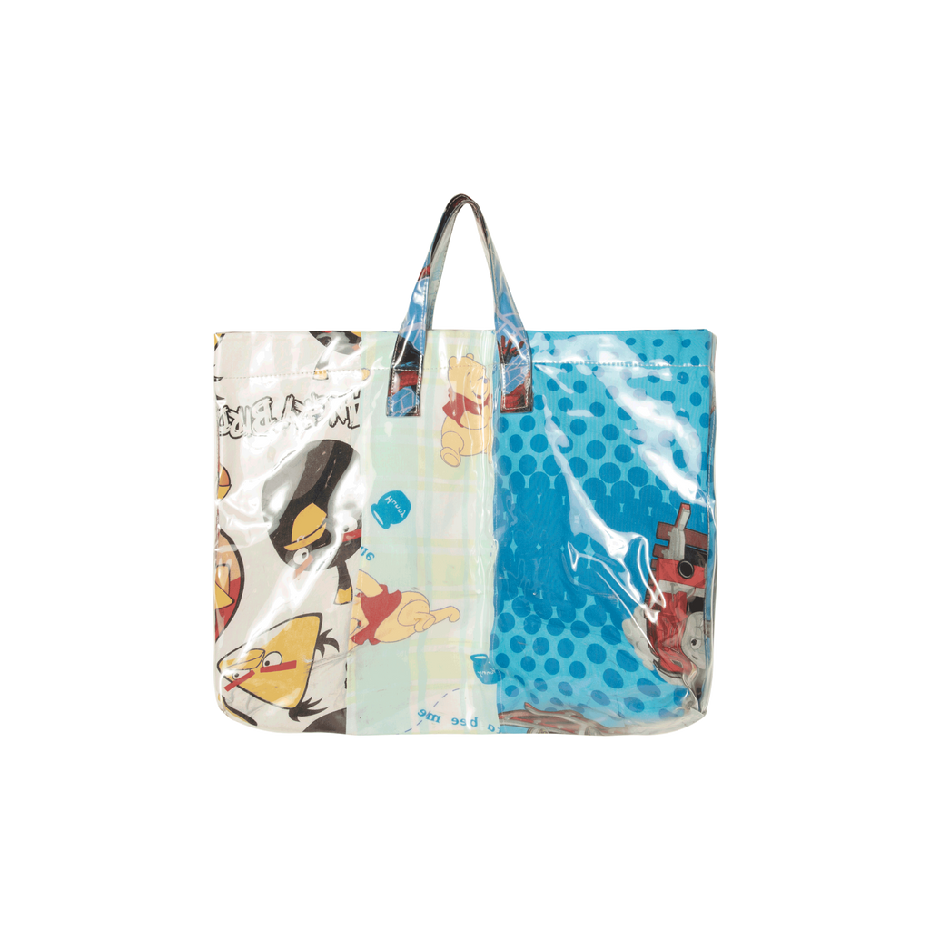 Comme Des Garcons SHIRT Bed Sheet Tote Bag features children's cartoon bed sheets, top handles, open top design, main internal compartment, and internal slip pocket.