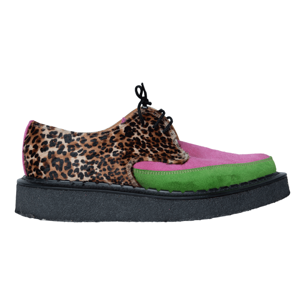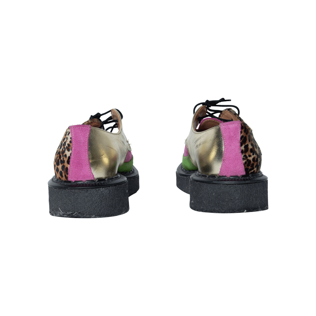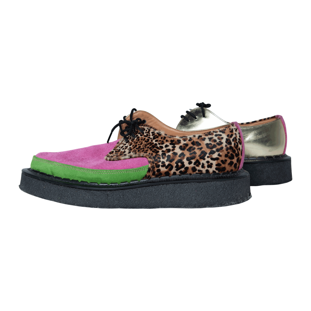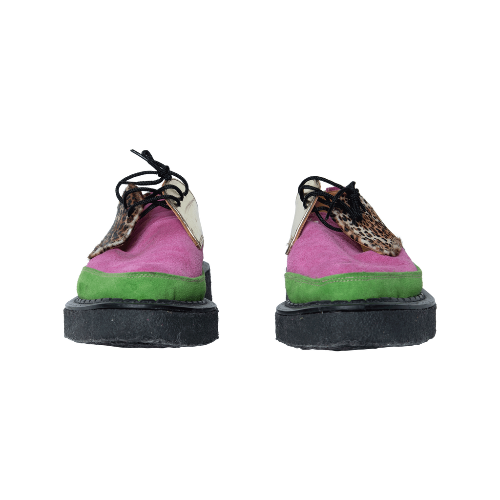 Comme des Garcons x George Cox Multi Colored Creepers features purple and green suede vamp, gold and cheetah print quarters, black laces, and platform sole.