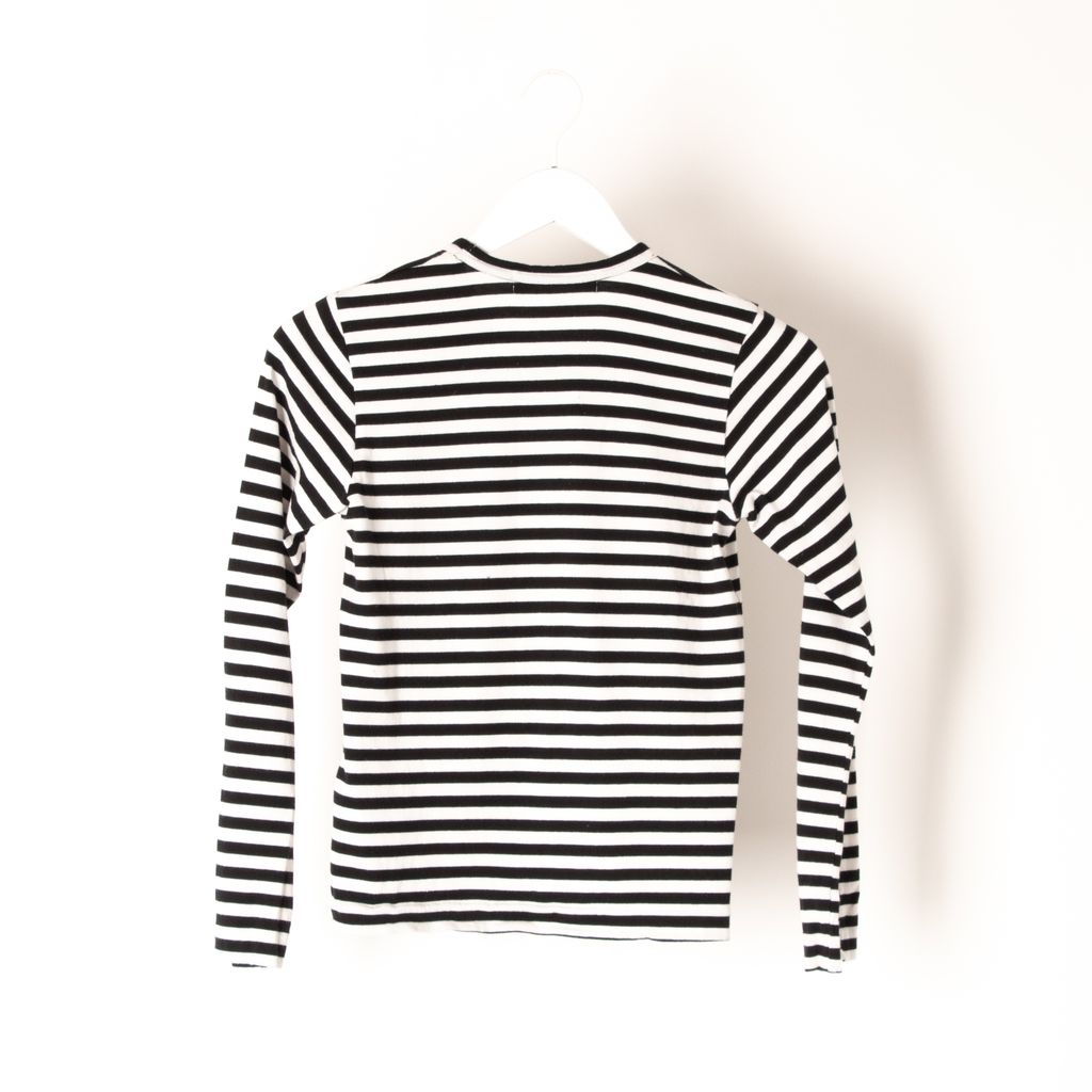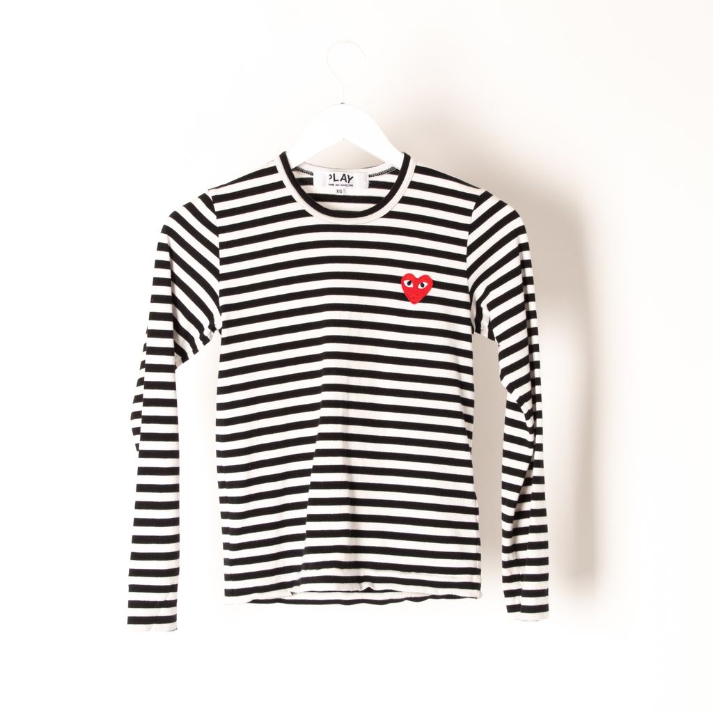 Like new, Comme des Garcons cotton top. Crew neckline, short sleeves, stripe pattern, heart logo on chest. Pull on finish, 100% cotton.