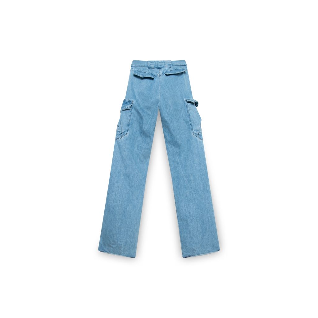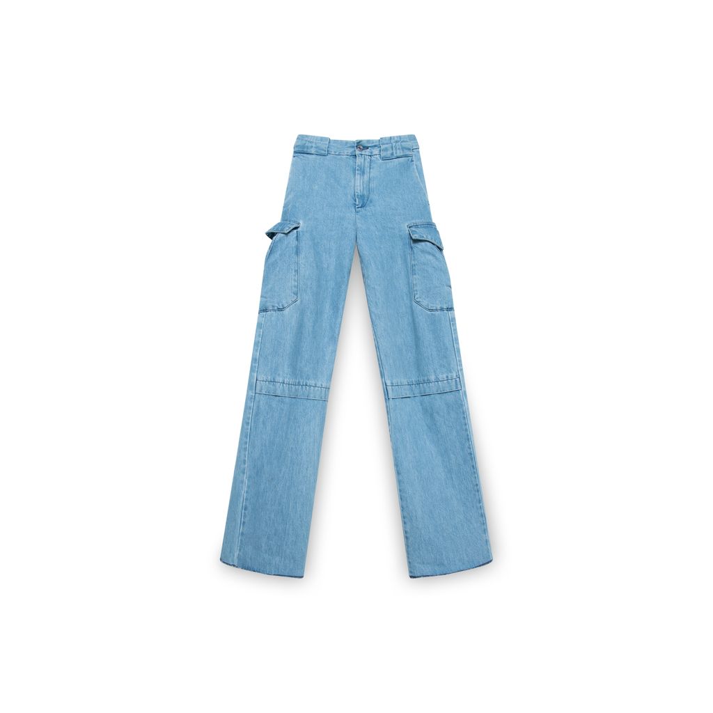 Commission Denim Cargos features 6 pocket styling, high rise, and wide leg.