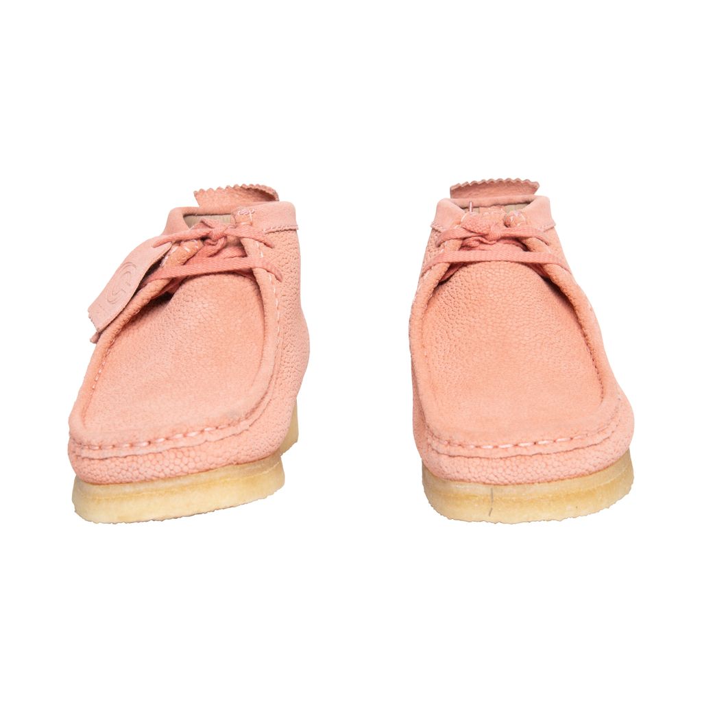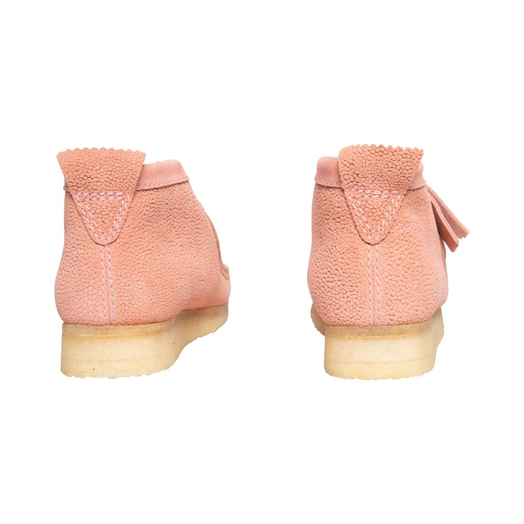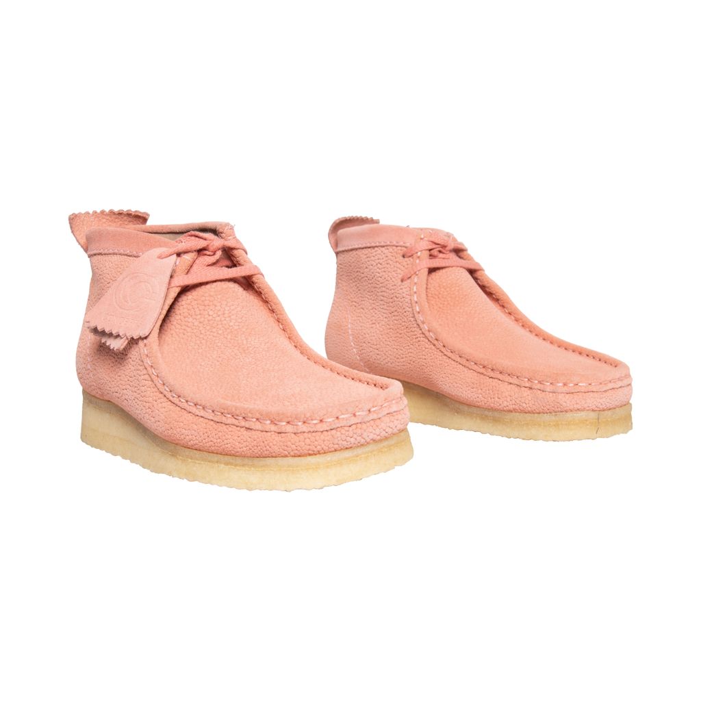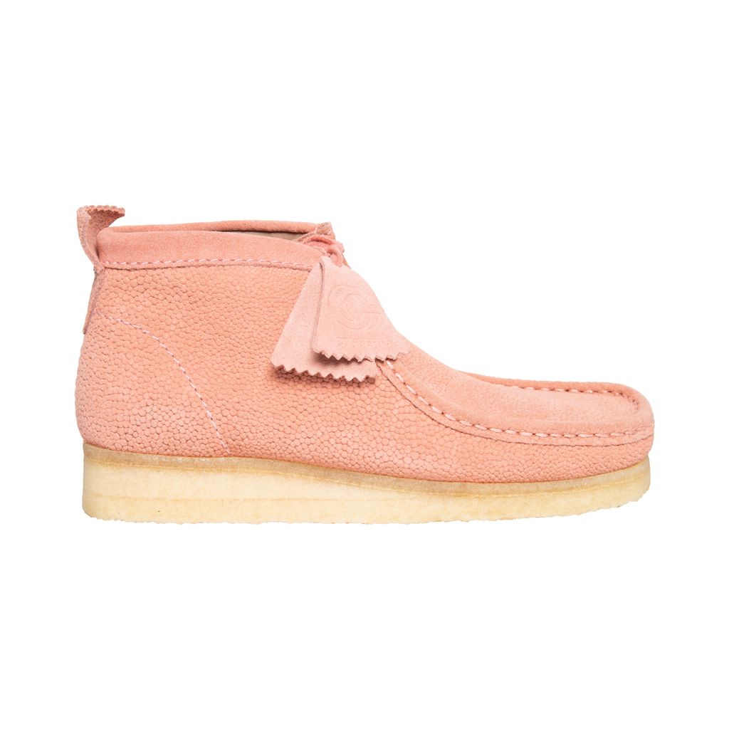 Concepts Pink Clark Wallabee features moccasin construction, lace up style, crepe sole, and structural silhouette.