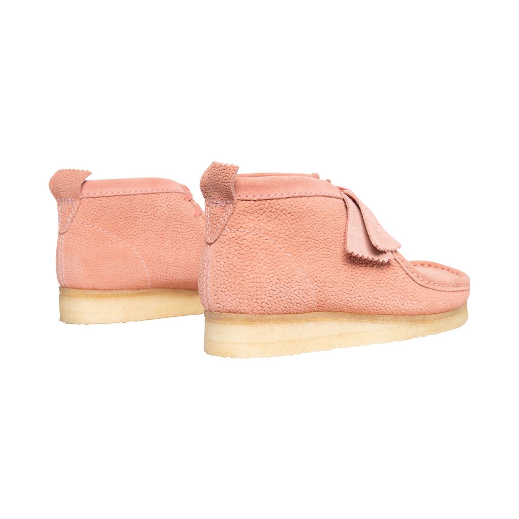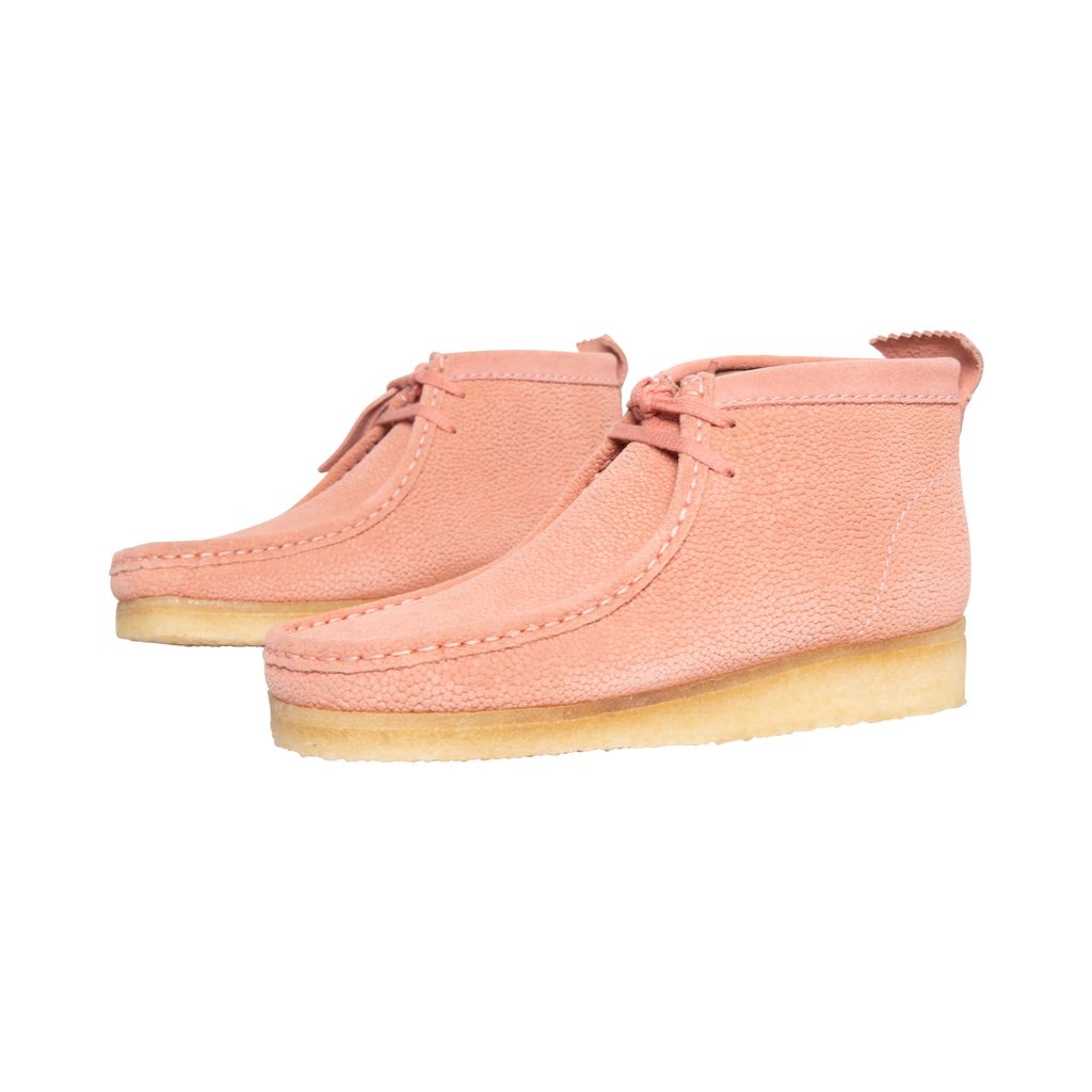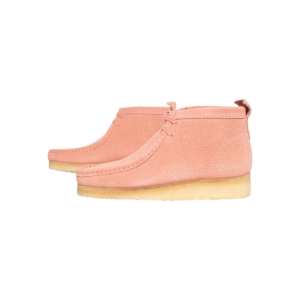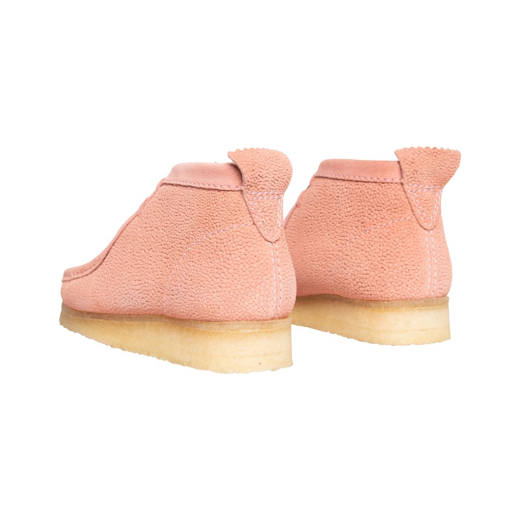 Concepts Pink Clark Wallabee features moccasin construction, lace up style, crepe sole, and structural silhouette.