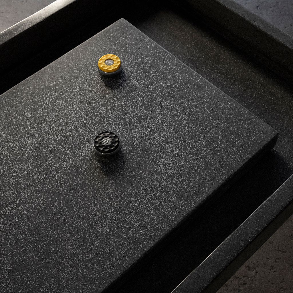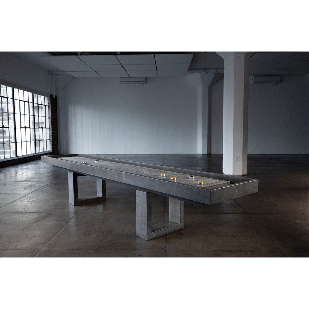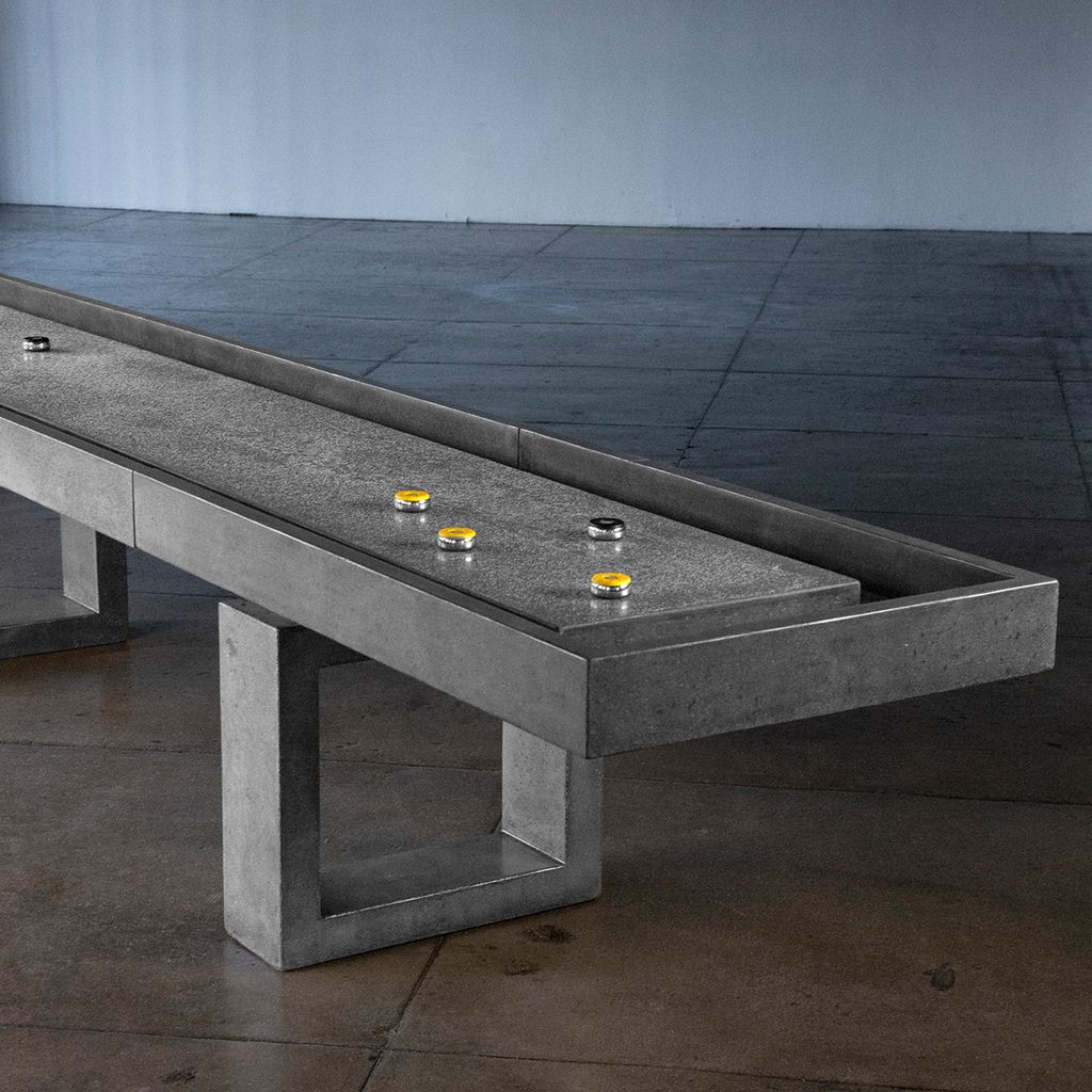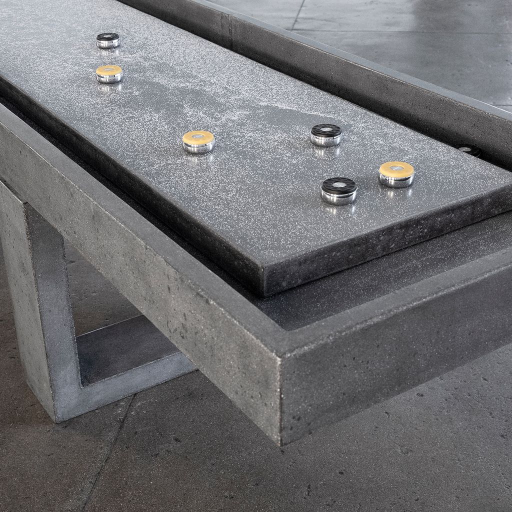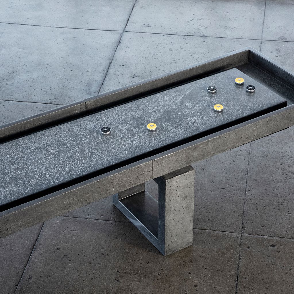 The James de Wulf Shuffleboard table is a lively addition to any game room. The 160" table is constructed of concrete reinforced with carbon fiber. The smooth glide of the pucks across the finished concrete, paired with the table's brutal design, creates a unique experience for the player.