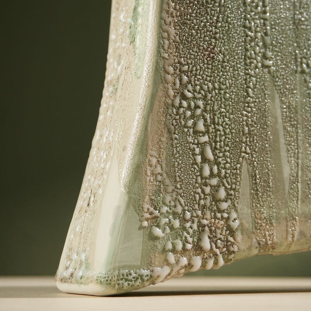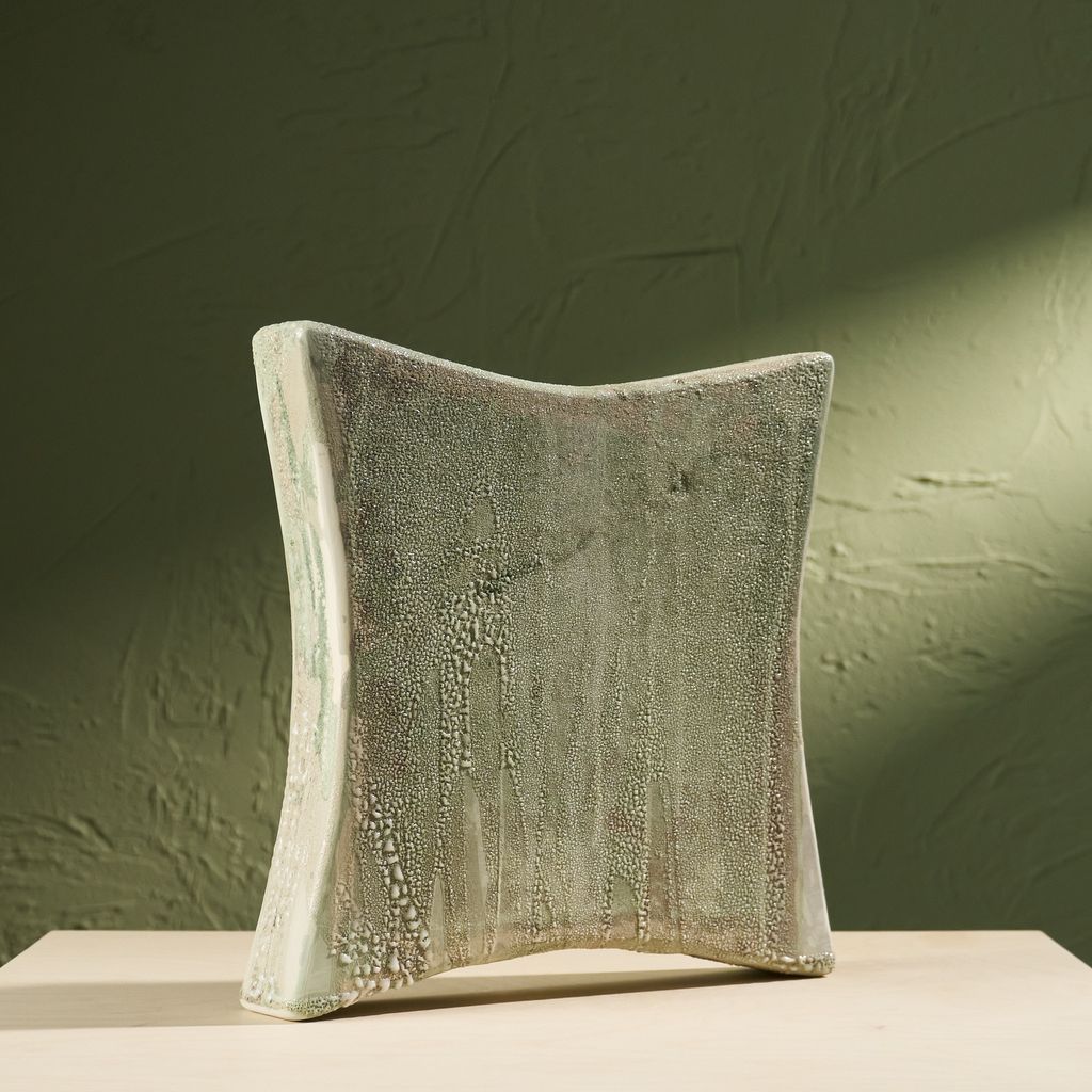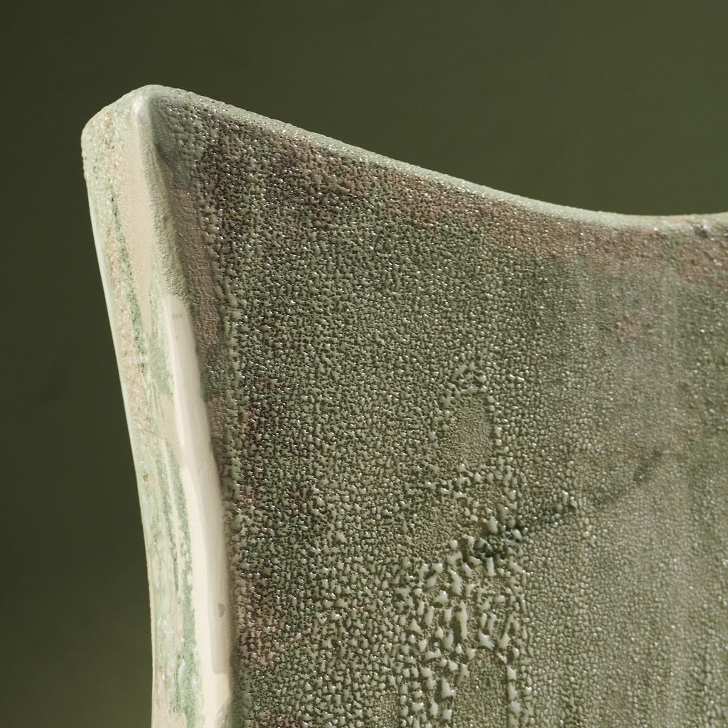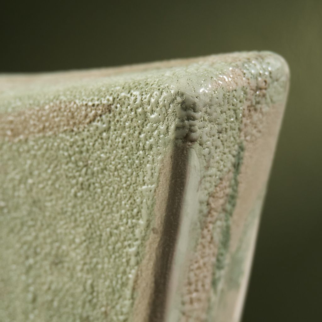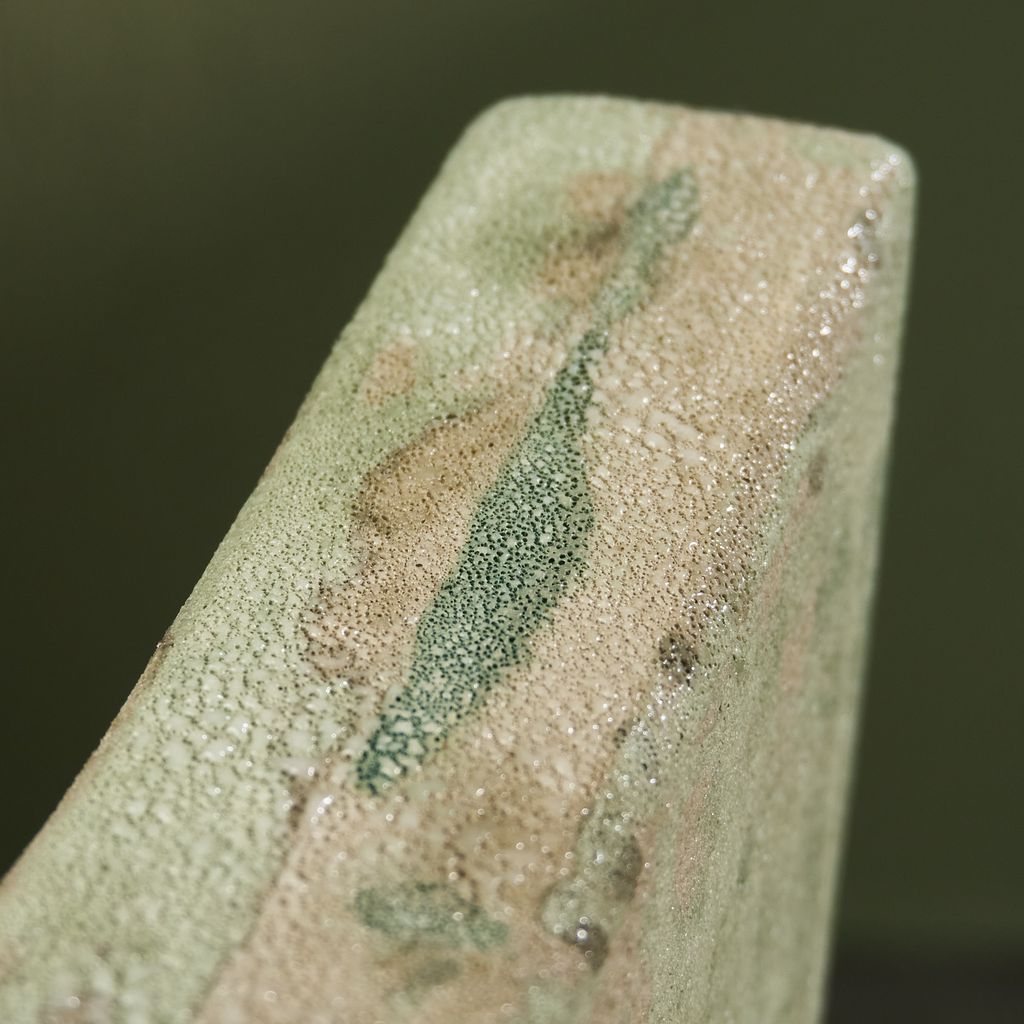 This sculpture is inspired by the moisture-covered windows often seen in the Netherlands. The artist translated the soft, blurred landscapes created by condensation into ceramic works. Using a glaze developed specifically for this series, the surfaces capture the appearance of moisture gathering. The collection reflects brief, disappearing moments of daily life through a quiet, poetic lens. She is currently expanding the Condensation Collection, first presented at Dutch Design Week 2025.