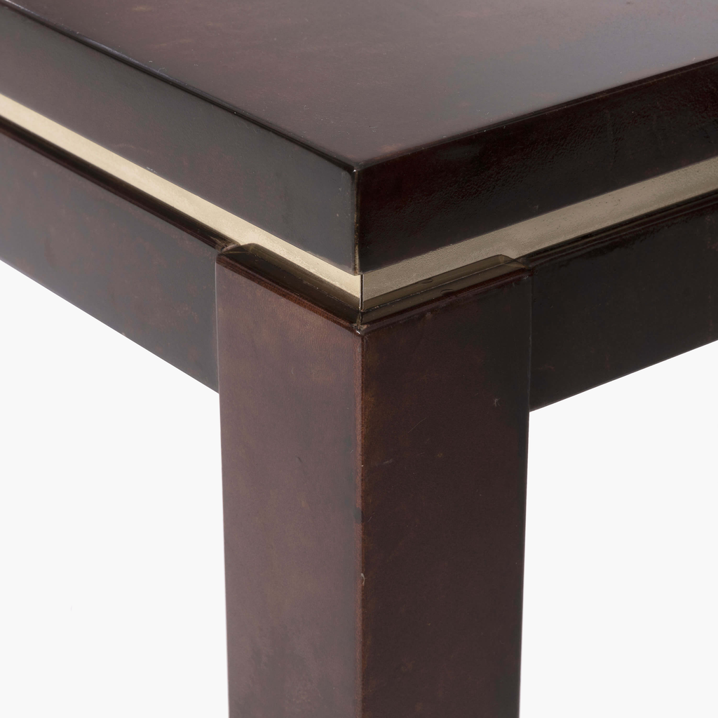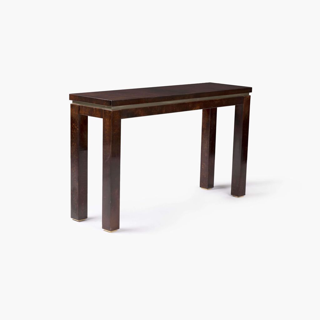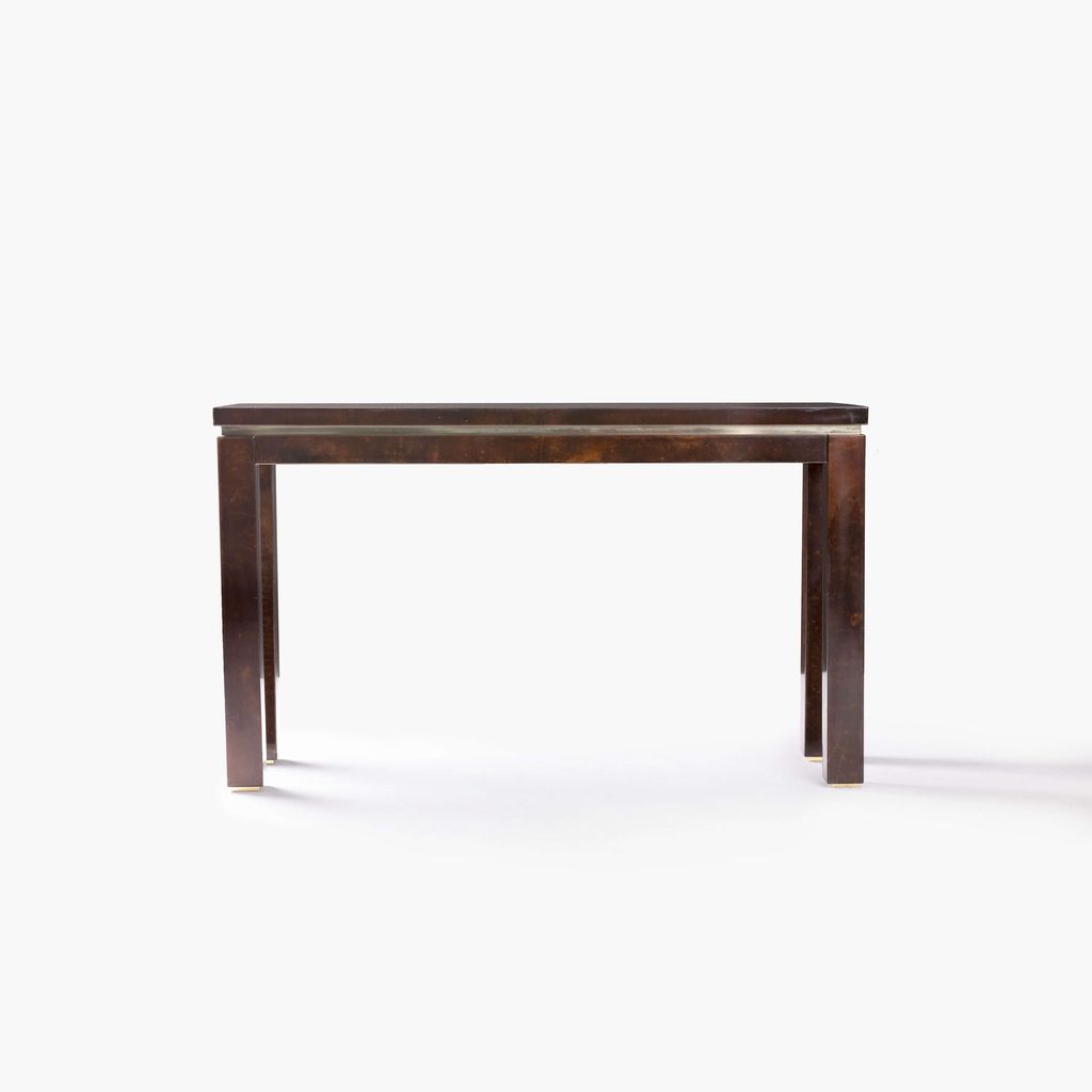 The luxe materials and exceptional craftsmanship of this parchment console mark an unequivocal nod to the style of Aldo Tura, whose modern furniture designs often tilted towards glamour. Tura was known for his use of goatskin parchment, applying it to a myriad of home furniture and entertainment pieces.