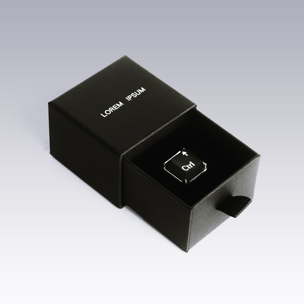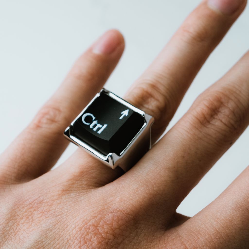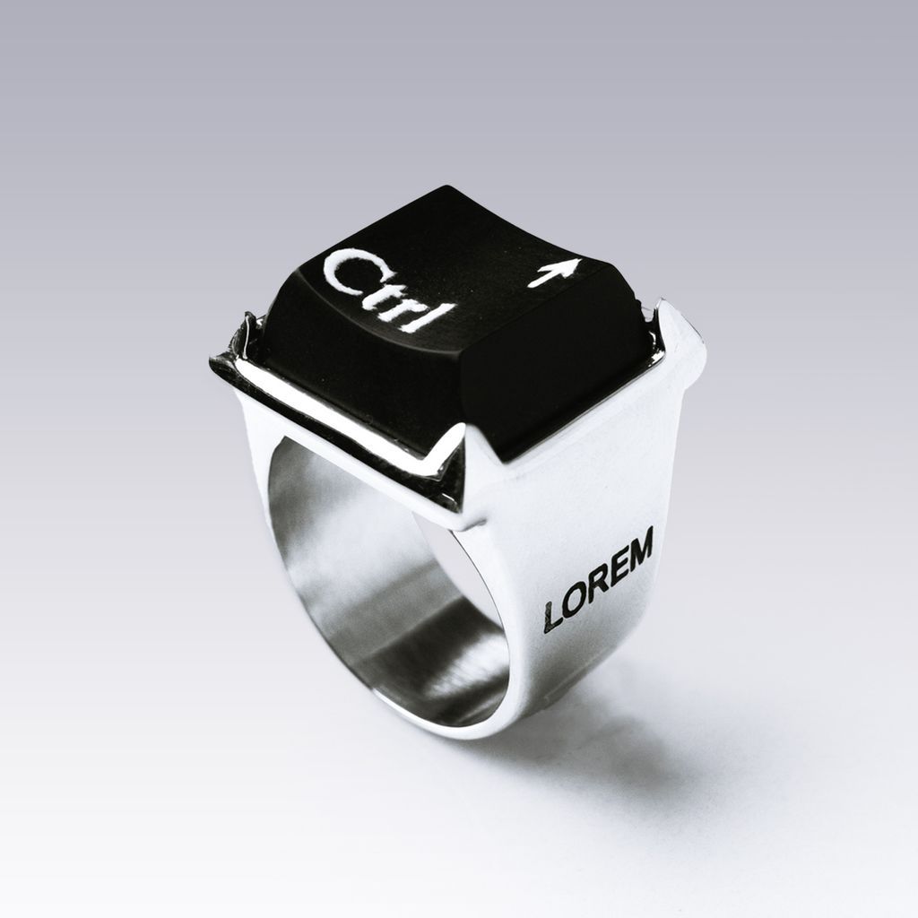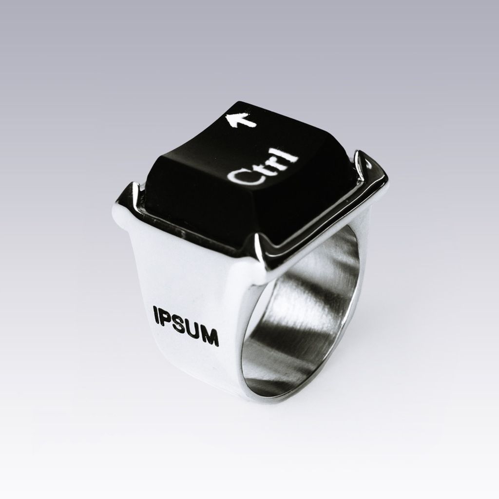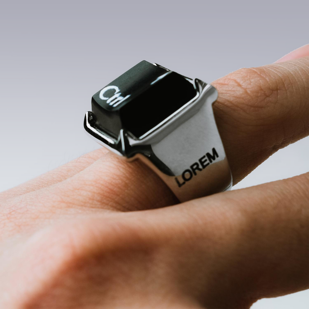 A signet ring inspired by the everyday keyboard, designed for persuasion and executed to perfection. Details include a stainless steel band with a black printed cap and logo engraving. Please DM us on IG to specify sizing. Details: - Premium stainless steel band - Custom molded keycap - Logo engraving at sides - True to size (available in ring sizes 6, 7, 8, 9) - Ships with branded box