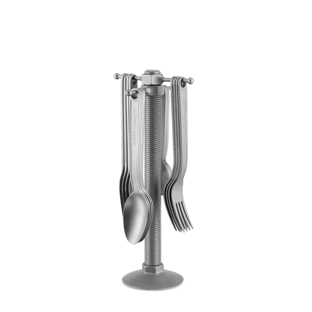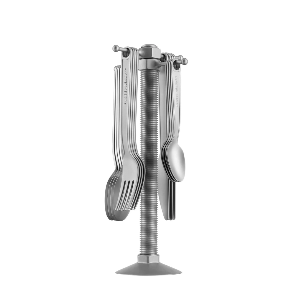 Following his interest in tradition and good food. Virgil Abloh designed Conversational Objects as "toolsets for the dining table". With its garage-inspired design, the Conversational Objects 16-piece cutlery set and cutlery holder are meant to encourage conversation and conviviality at the dining table. This set, produced in matt-finish stainless steel, is paired with a cutlery holder, with a similarly opaque finish to resemble a threaded bolt. the connection between industrial assembly and design, the set will need to be assembled by its owner.