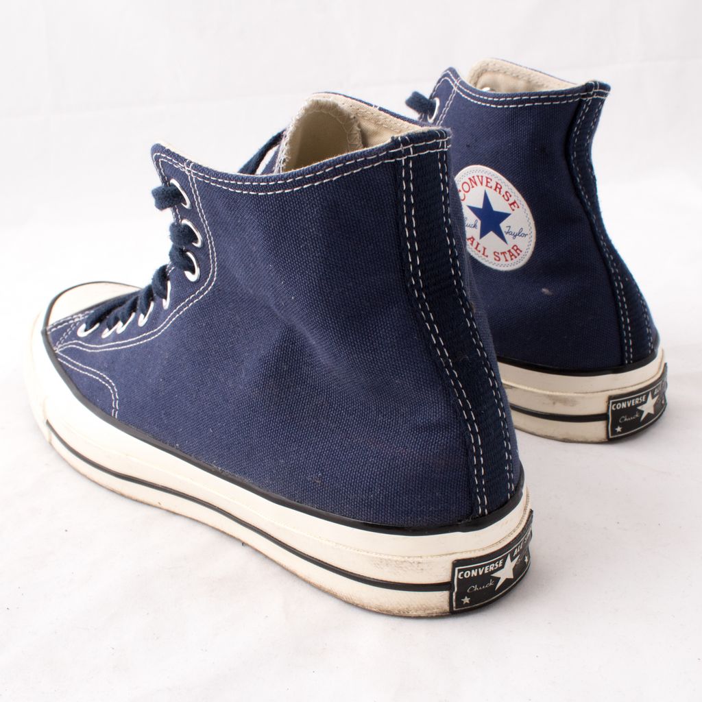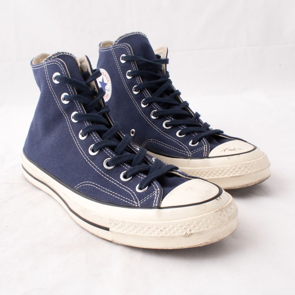 In fair condition. Men's All Star ’70 Hi in Midnight Navy feature a high top canvas upper, with a classic black accent at the midsole. Rubber midsole and outsole with Converse Chuck Taylor All Star branding at inner ankle.