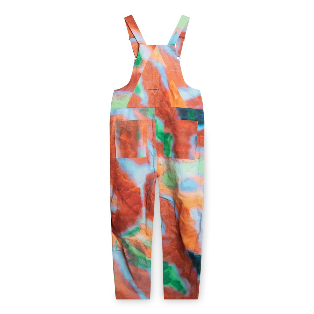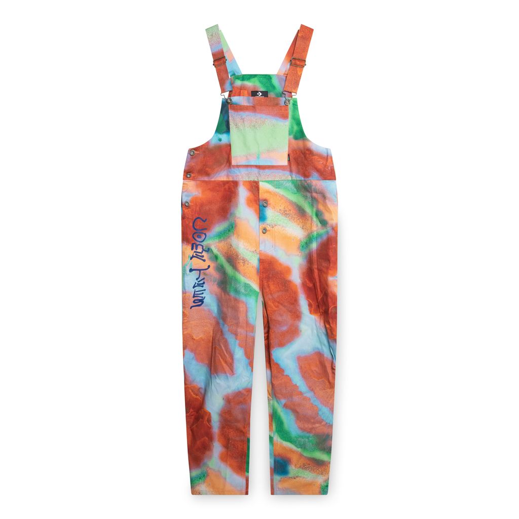 Converse x Come Tees Tie Dye Overalls features brass hardware, front chest pocket, and Come Tees logo on leg.