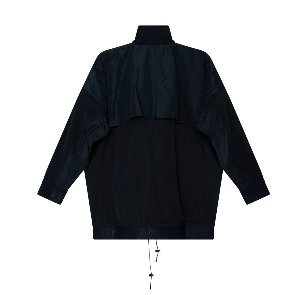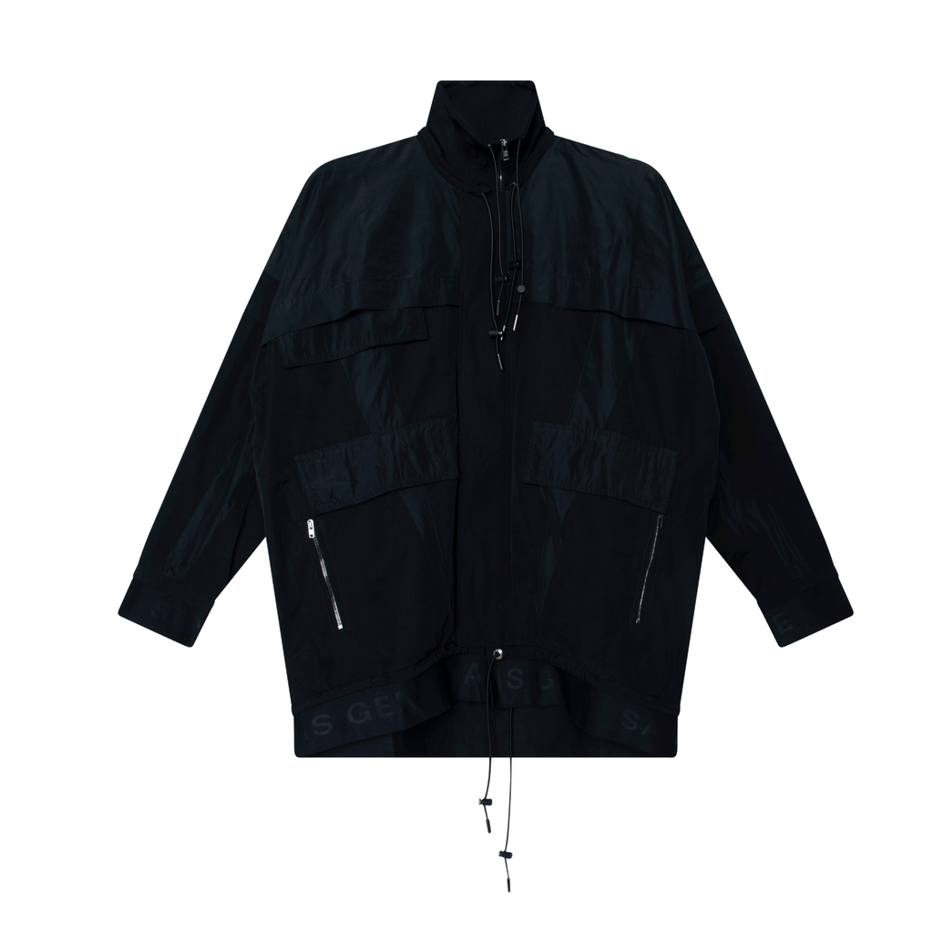 Convertible Nylon Jacket in Black features layered construction, removable sleeves, storm flap, welt pockets at front, zip closure at front and pockets, and elasticized suspenders at shoulders.