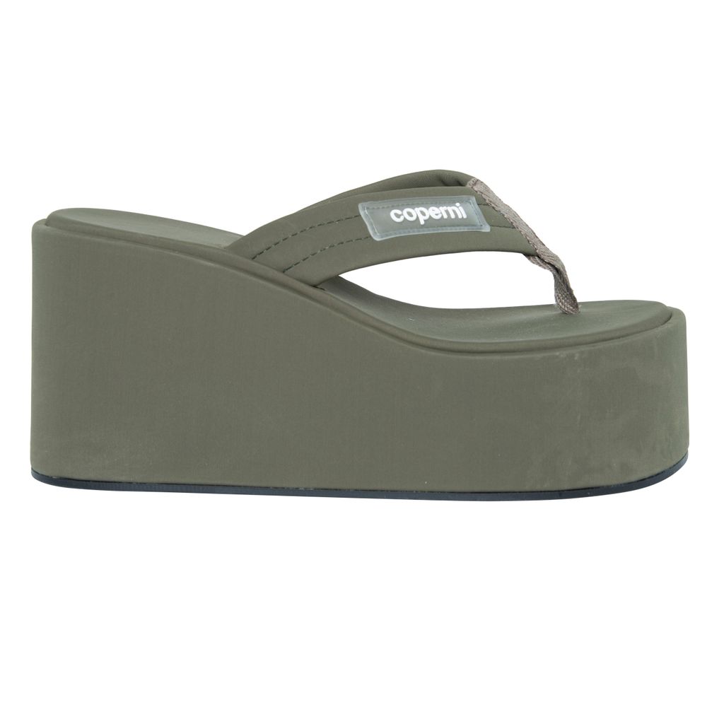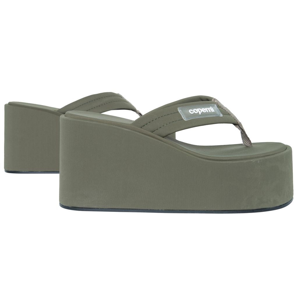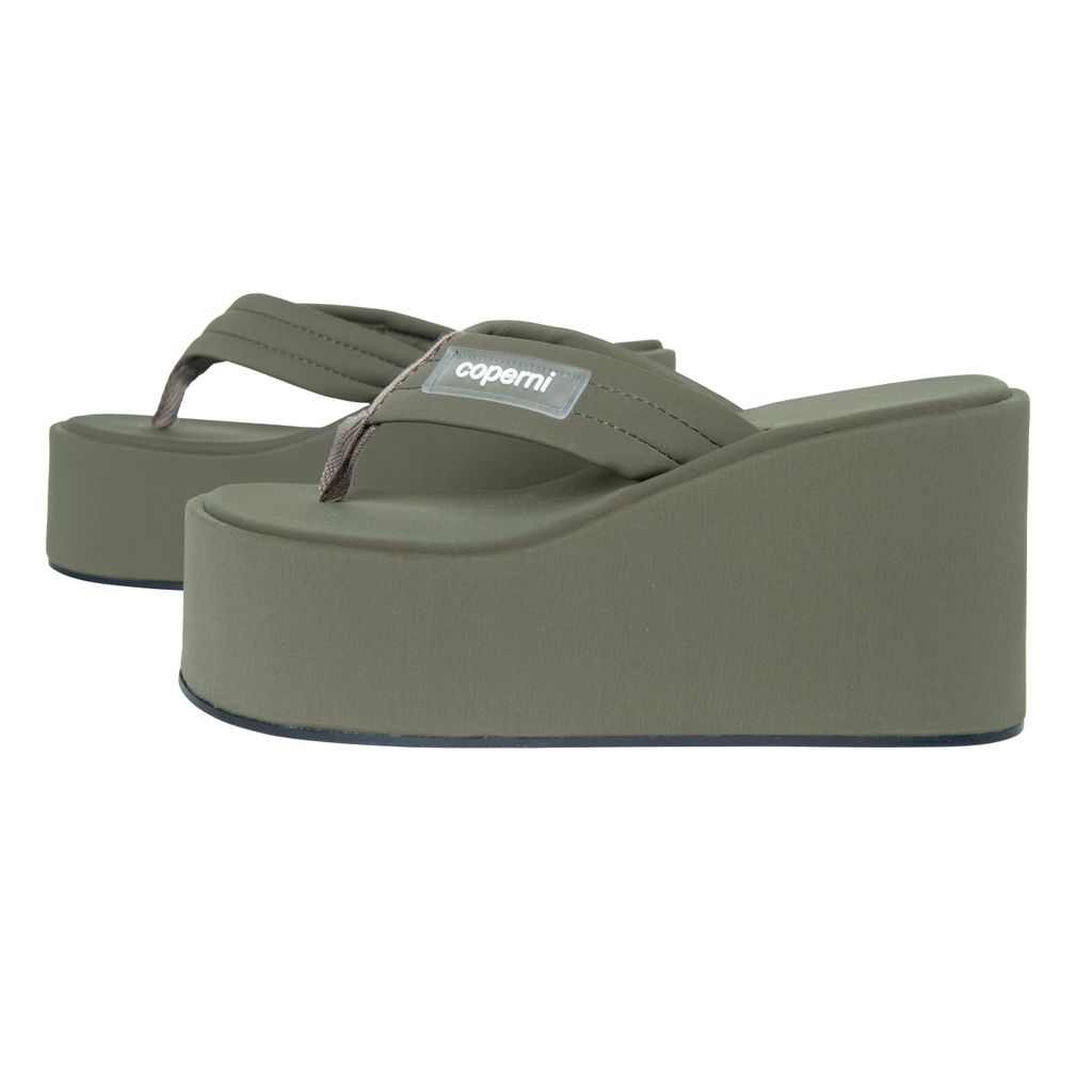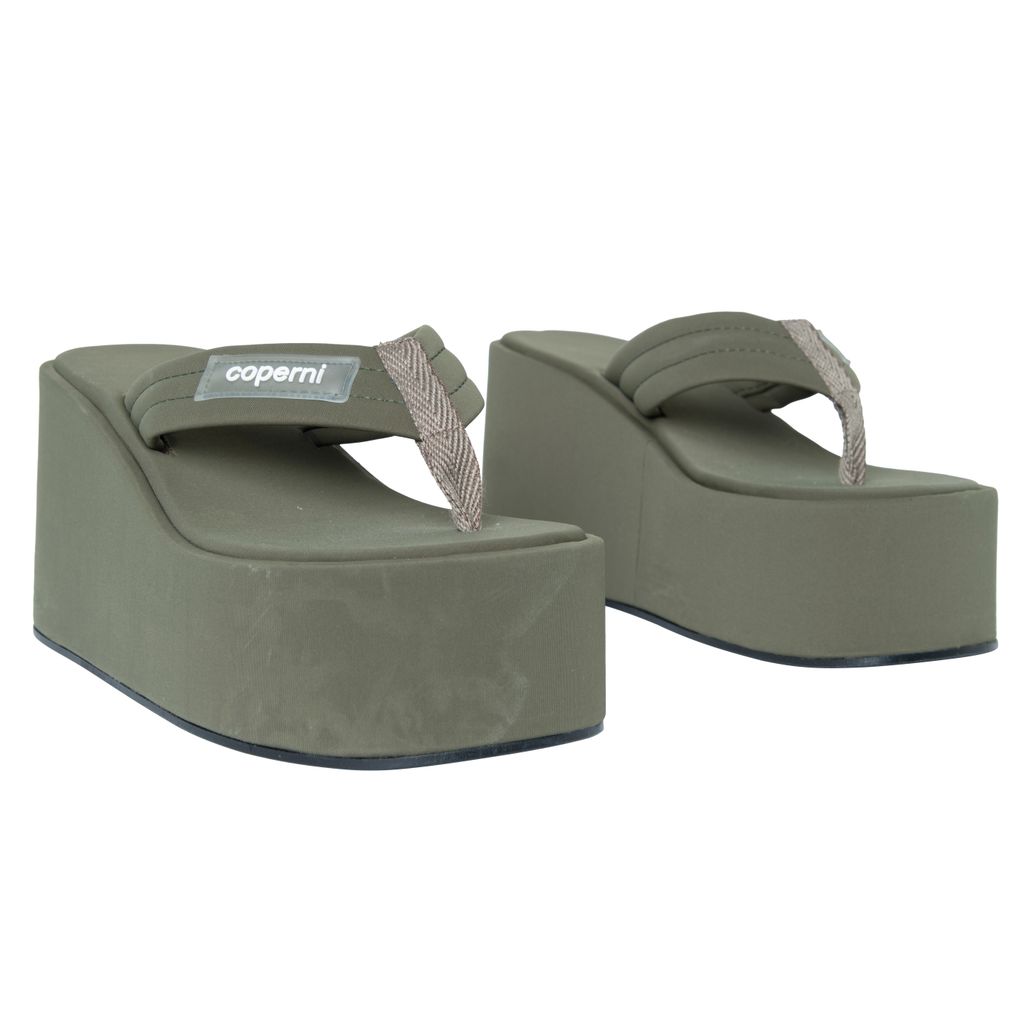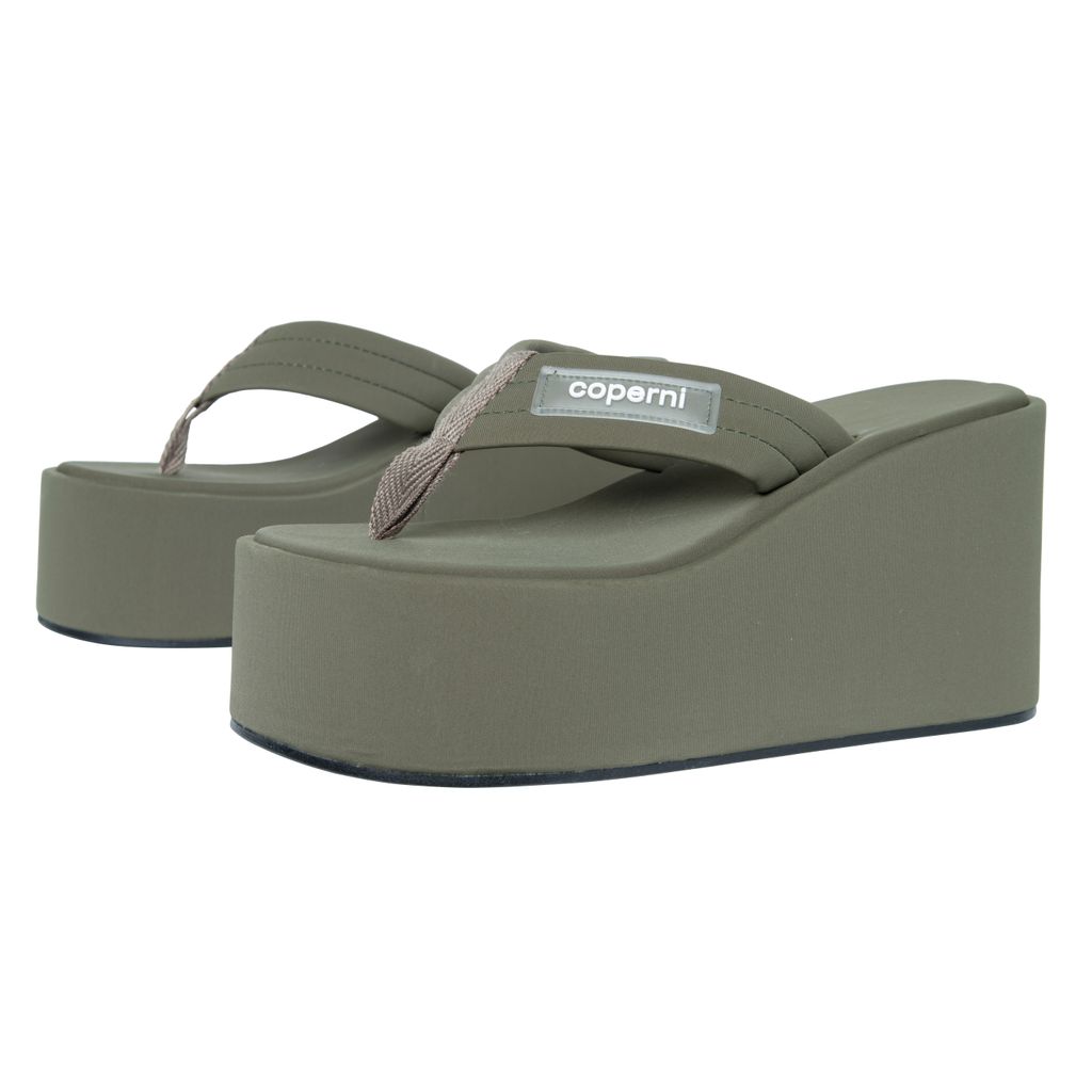Coperni Khaki Branded Wedge Sandals in Green features thong style strap at vamp, rubberized logo patch at strap, and rubber outsole.