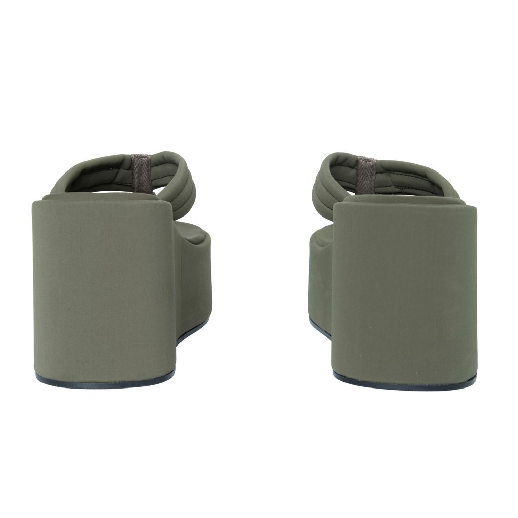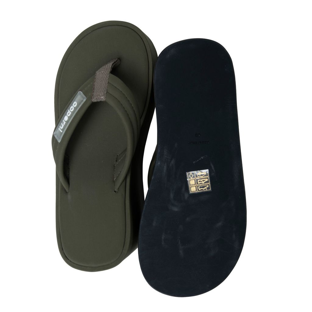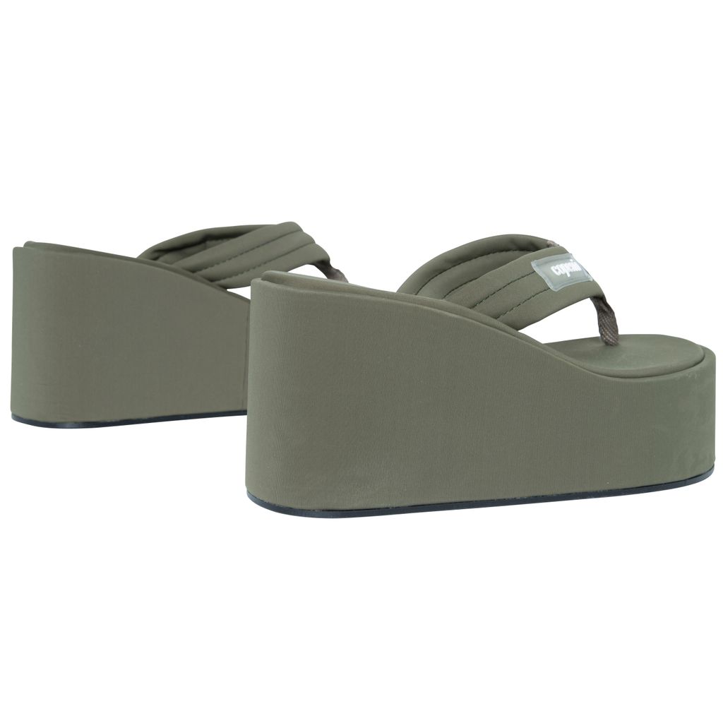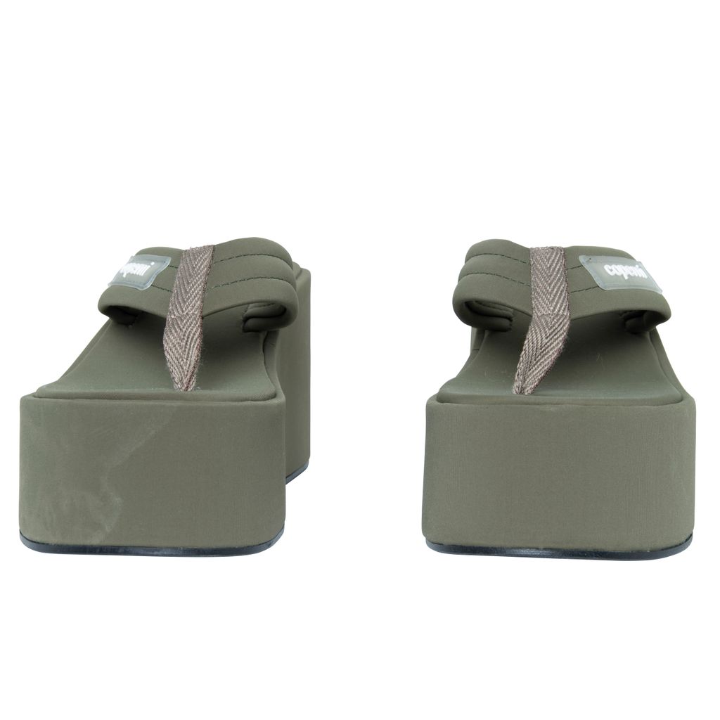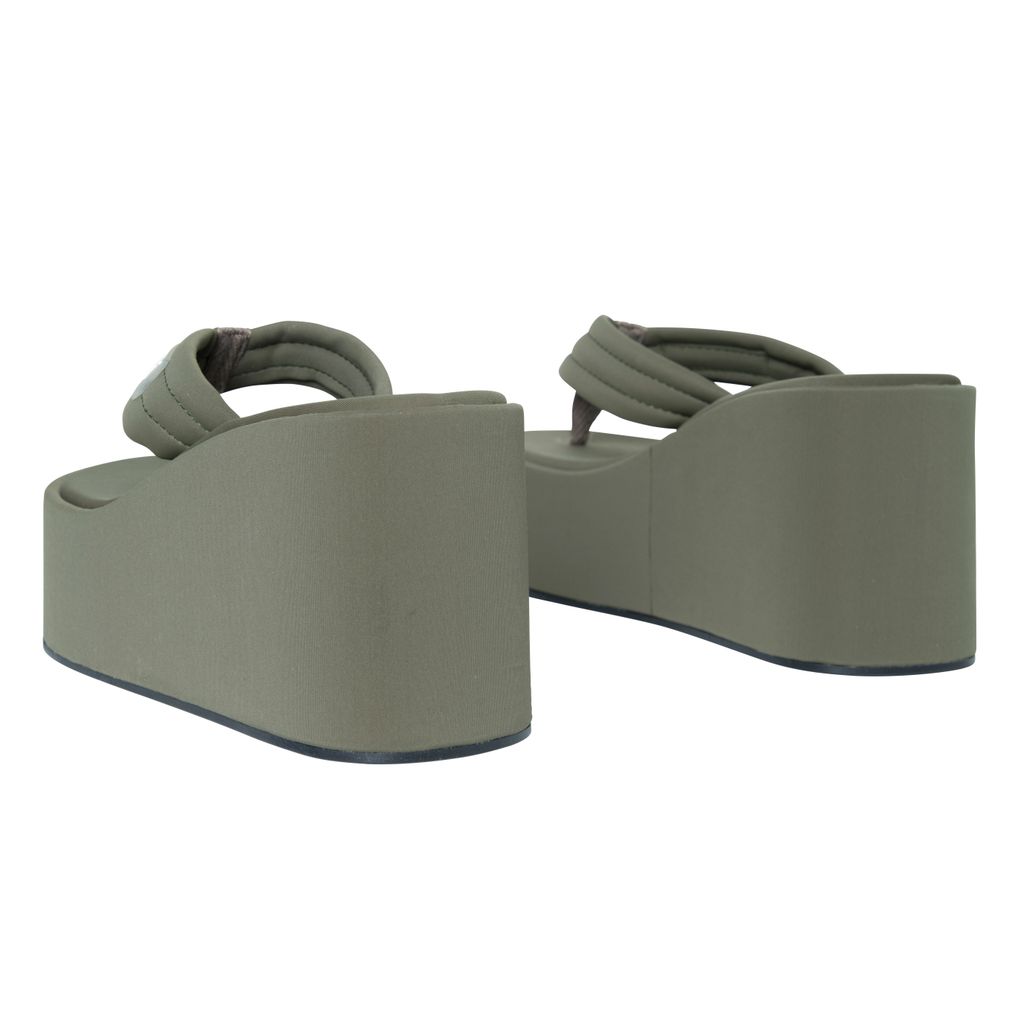 Coperni Khaki Branded Wedge Sandals in Green features thong style strap at vamp, rubberized logo patch at strap, and rubber outsole.