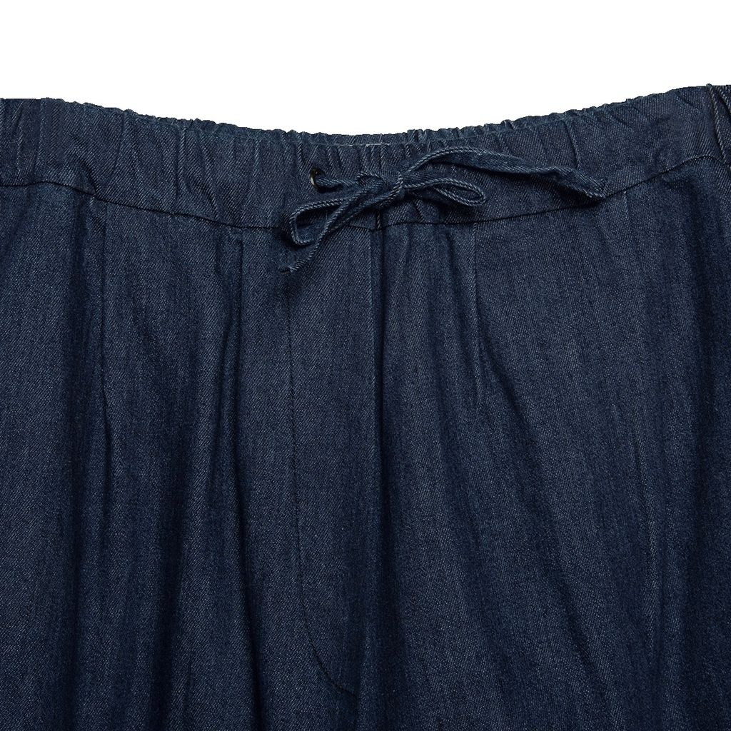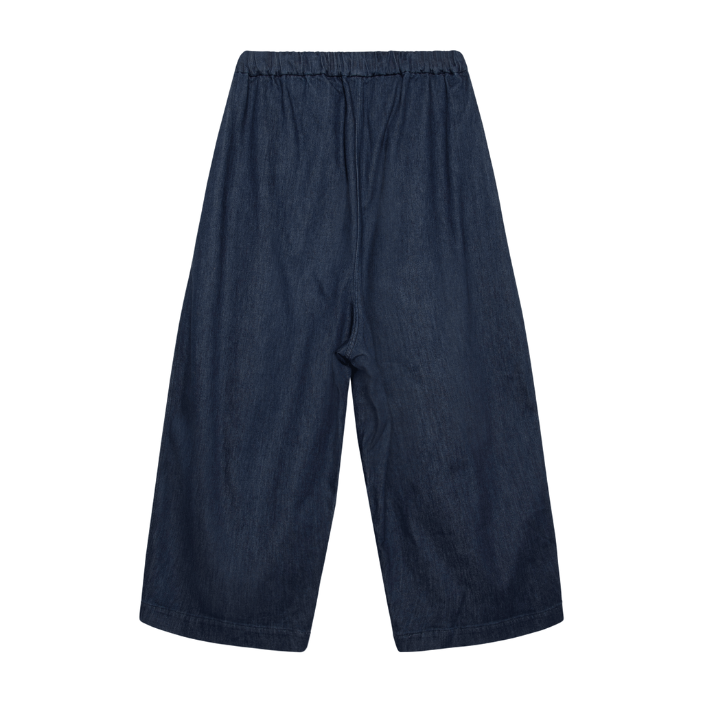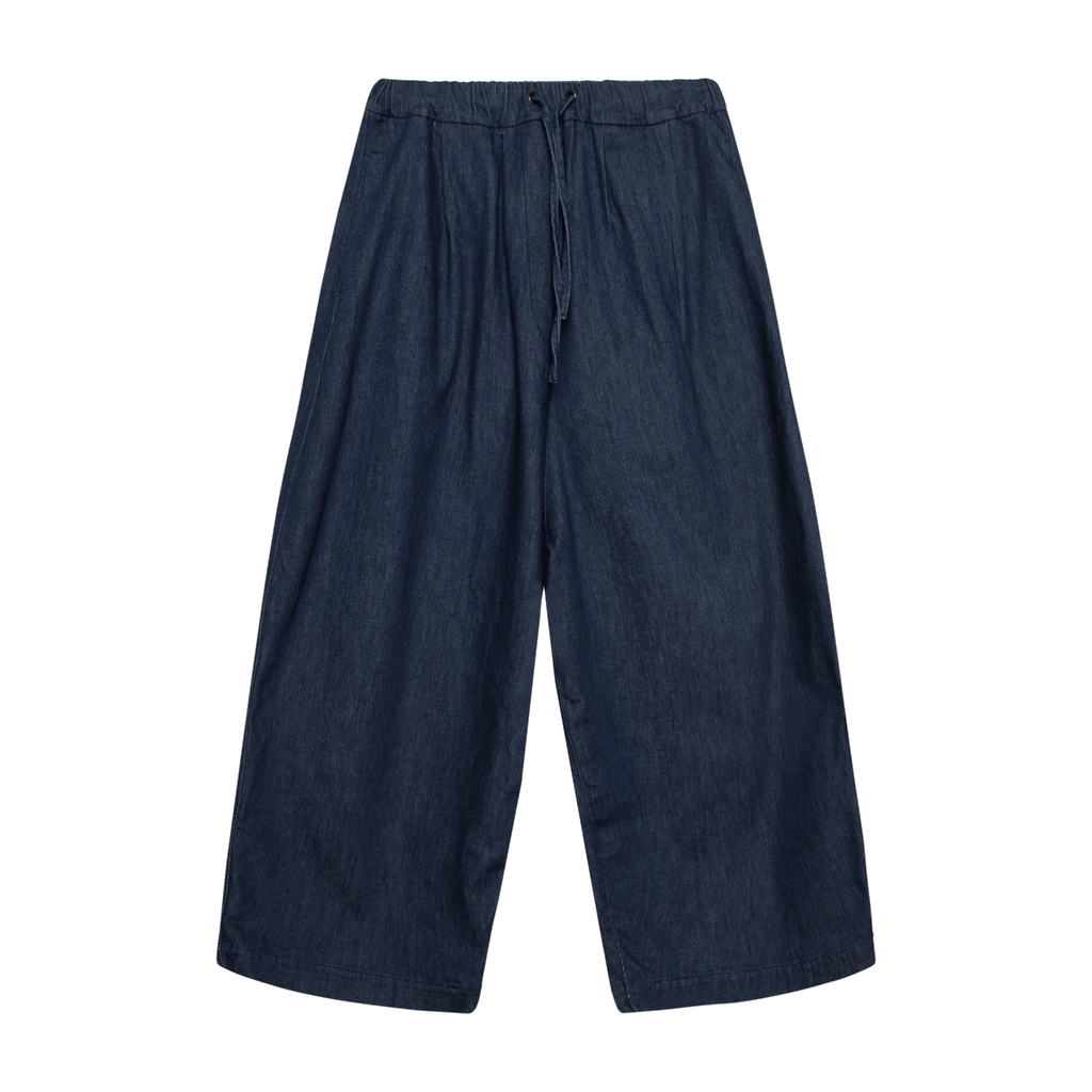 Deep indigo denim, drawstring pants, relaxed fit, side pockets