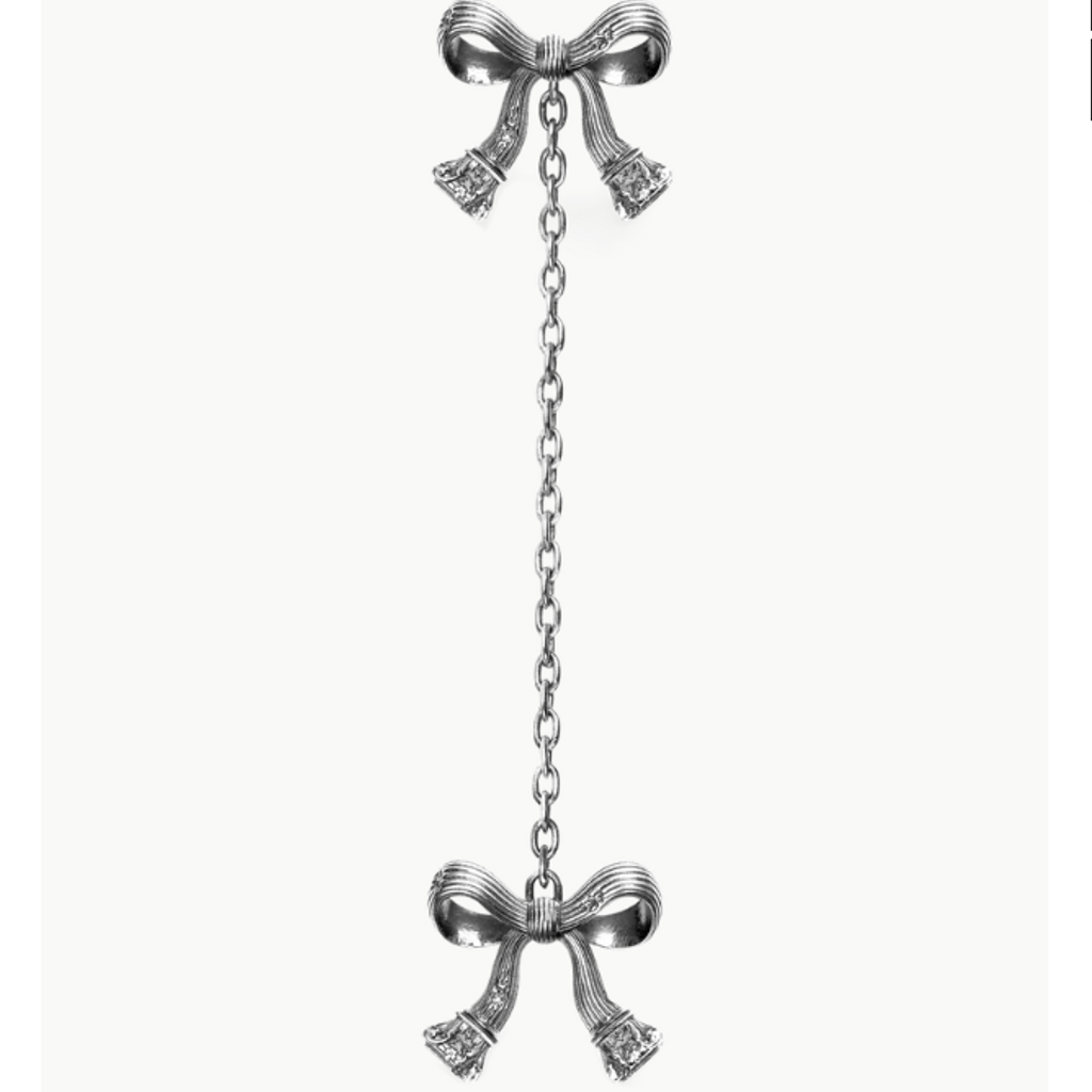 Signature Corinthian Bow motif drop earring. 2.5-inch drop. Richly detailed Floral Column capitals.