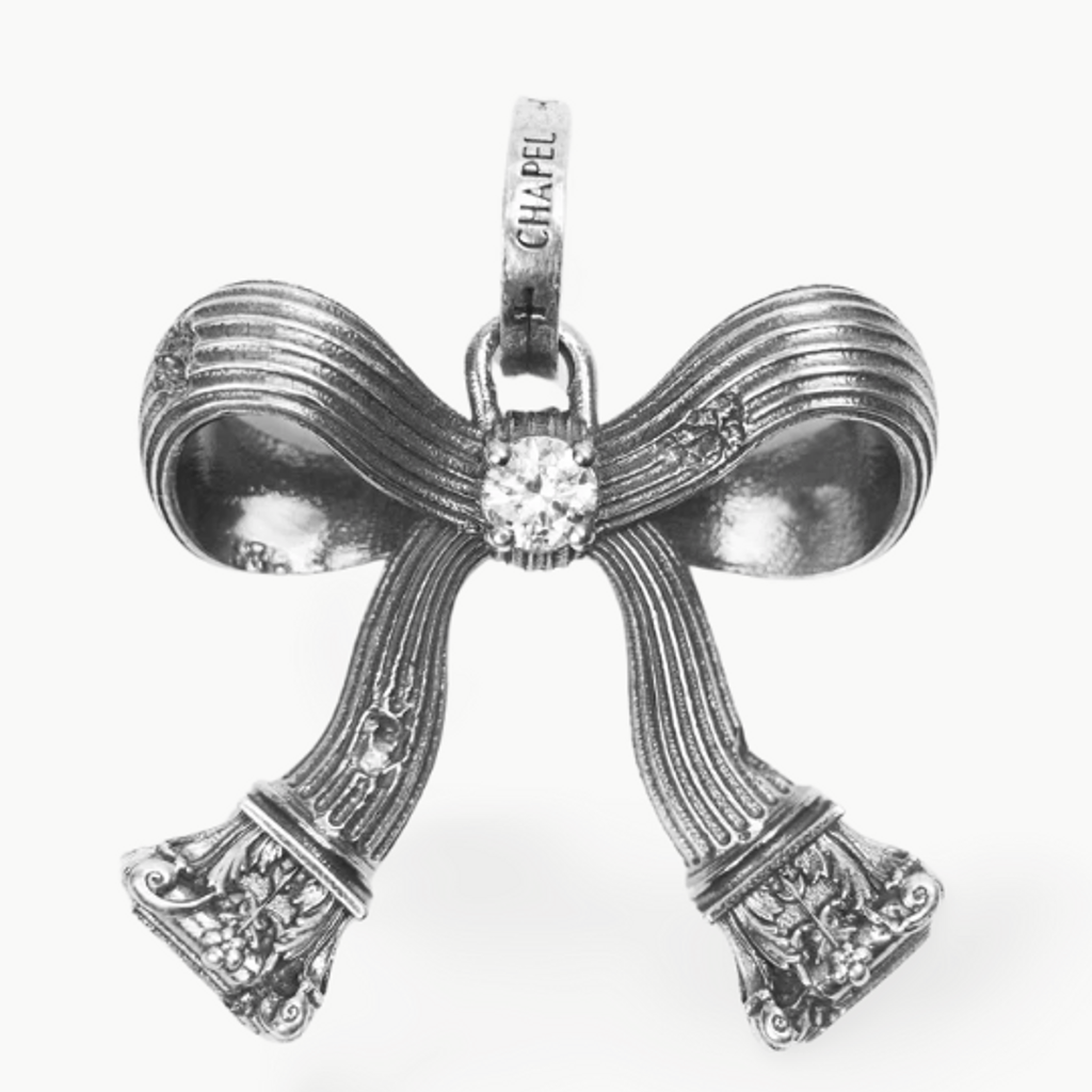 Intricate Corinthian Bows, in solid Sterling Silver. Floral Corinthian detailing. Inset with atural VS diamonds.