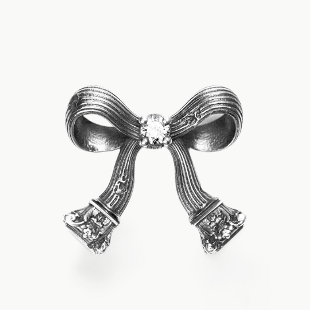 Signature Corinthian Bow motif stud earring. Richly detailed Floral Column capitals. Inset with 0.05ct natural diamond of VS clarity.