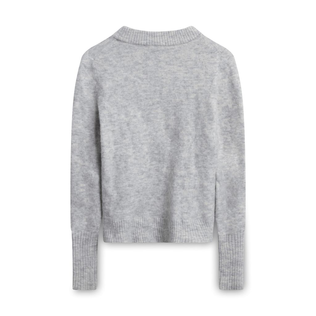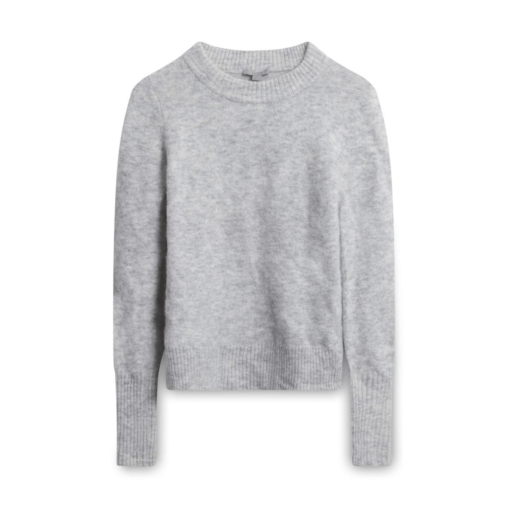 Grey sweater with a ribbed collar, end sleeves, and sweater bottom.