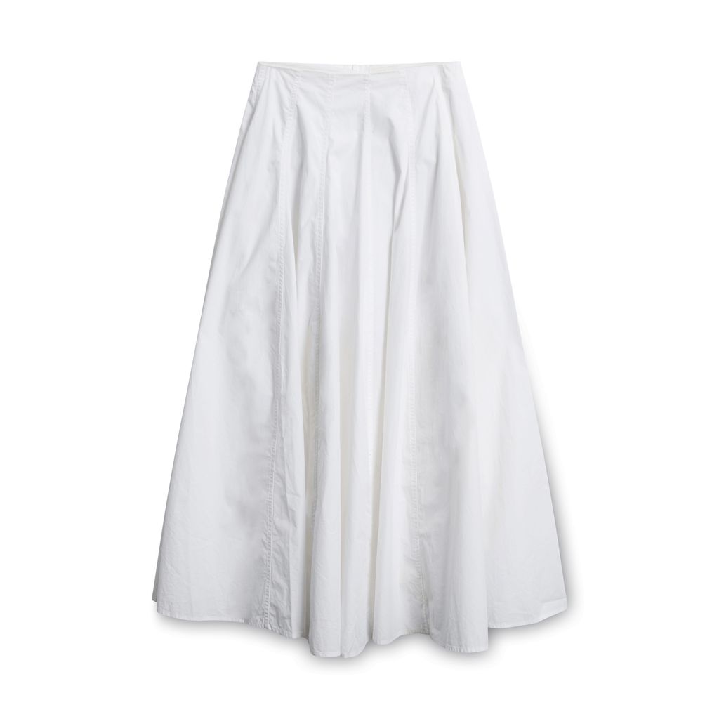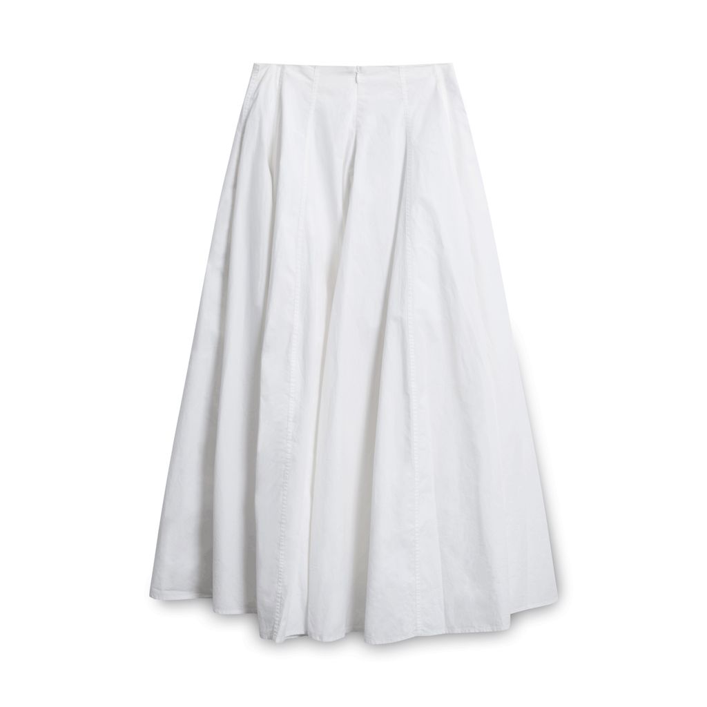 White maxi skirt with two hidden pockets and a zipper down the back. Skirt features decorative false sewn pleats and a built-in slip.