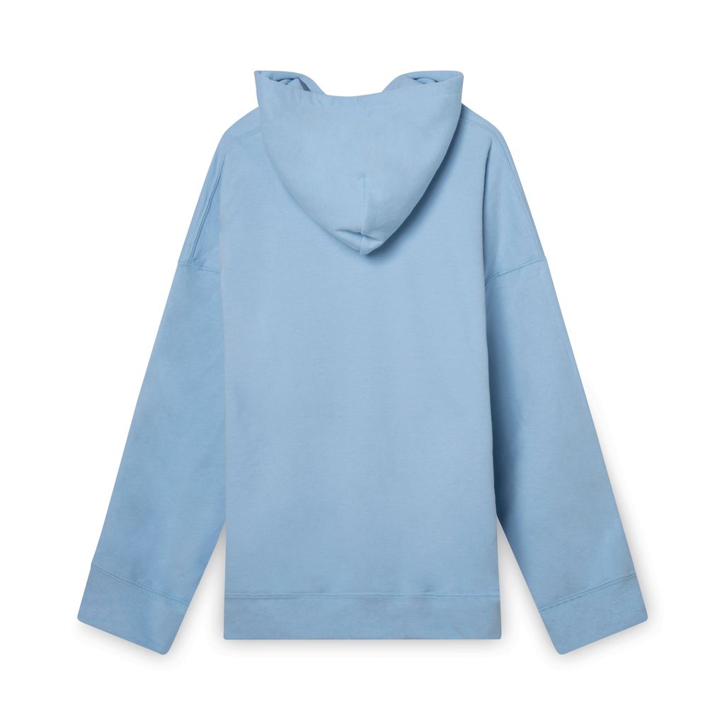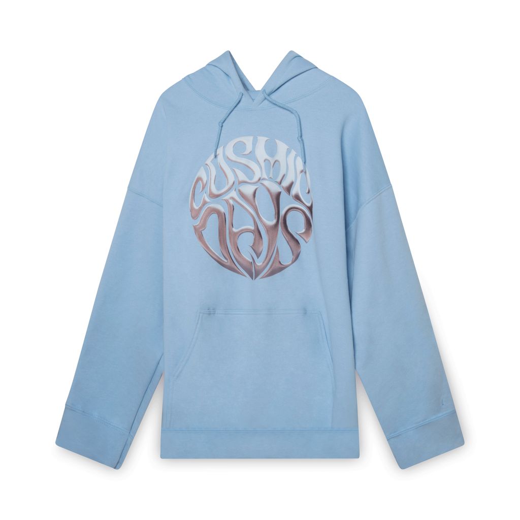 Light blue oversized sweatshirt with tonal drawstring ties and screen printed COSMIC DAYS logo on chest. Finished with kangaroo pouch at waist and rib knit cuffs and hem.