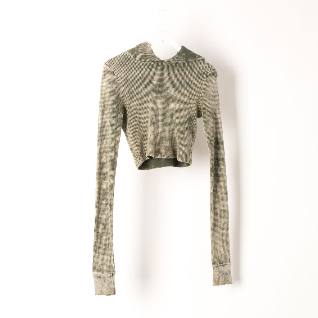 Like new, The Monaco Crop Hoodie is a slimming new silhouette cut from a novelty Military Thermal. This piece is grinded and distressed by hand throughout the body for a unique contemporary look.