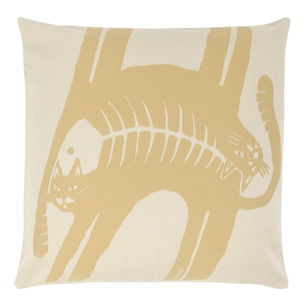 A comfy component of our cotton cat/fish capsule, these decorative pillows provide the perfect addition to any bed, couch, or outdoor seating area. Woven out of the same soft tan and light beige Italian cotton as our cotton tablecloth/napkins set, they are finished with a hidden zipper. Heavyweight cotton with raised jacquard catfish motif.