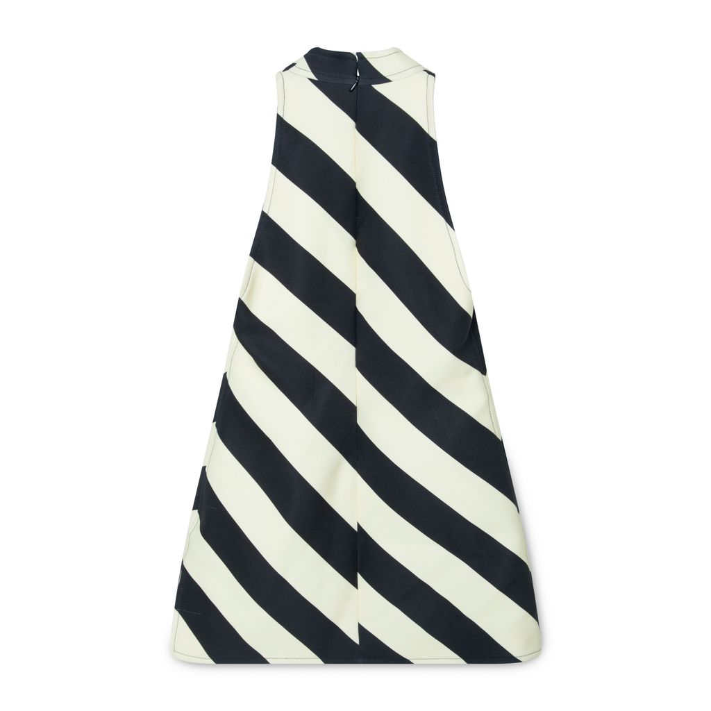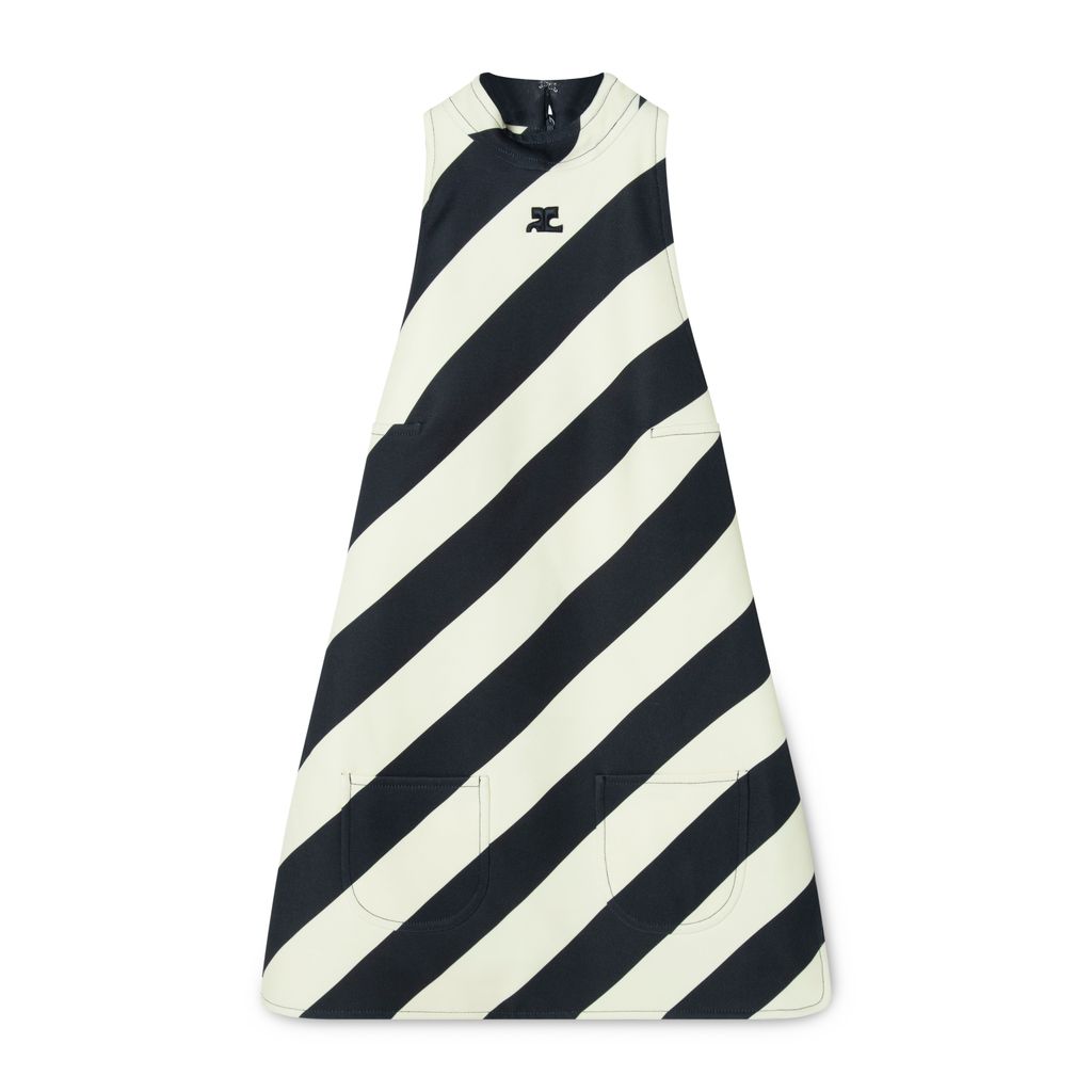 Courrèges Black and Yellow Striped Minidress features diagonal stripe print, embroidered logo on chest, 2 pockets on front, and straight hem.