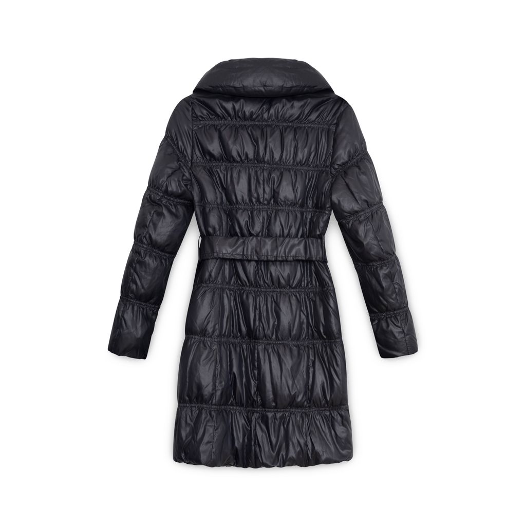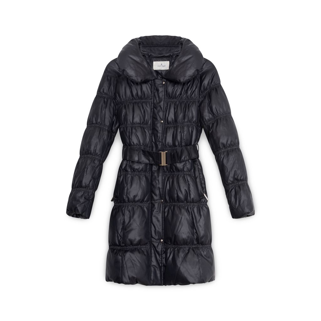 Courreges Black Belted Puffer Coat features zip and button closure, slant zipper pockets in front, adjustable belt, belt loops.