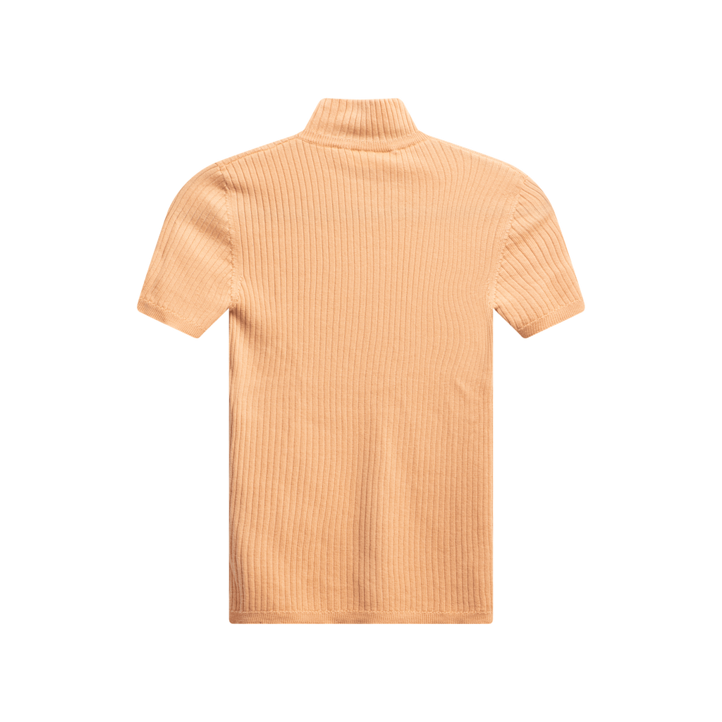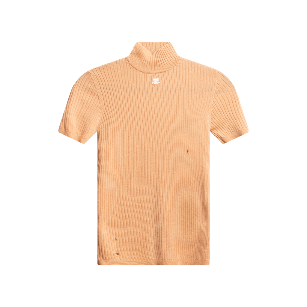Courreges Wool Sweater features mock neck collar, ribbed detail throughout, pullover fit. 3 very small holes in front panel of sweater.