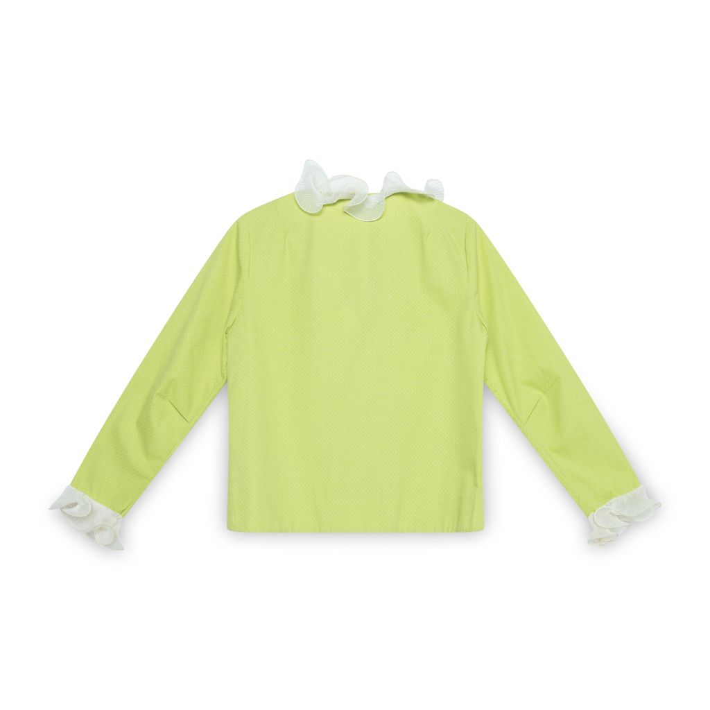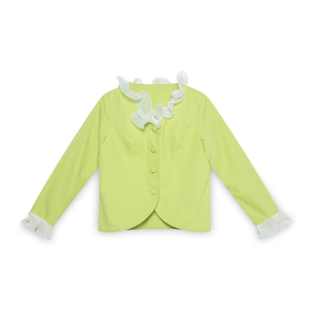 Cracker Jax Green Polka Dot Jacket features ruffle trim on collar and cuffs, front button closure, and white polka dot design.