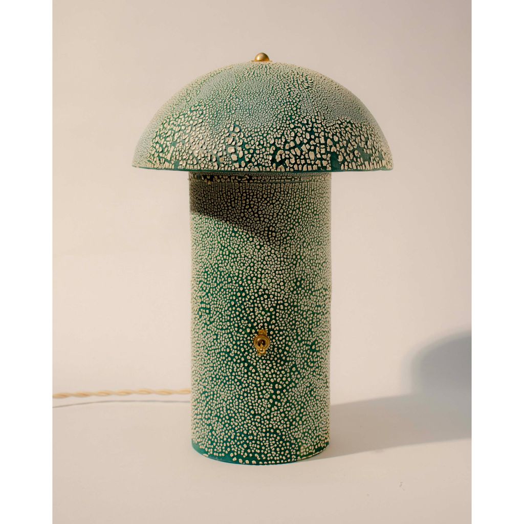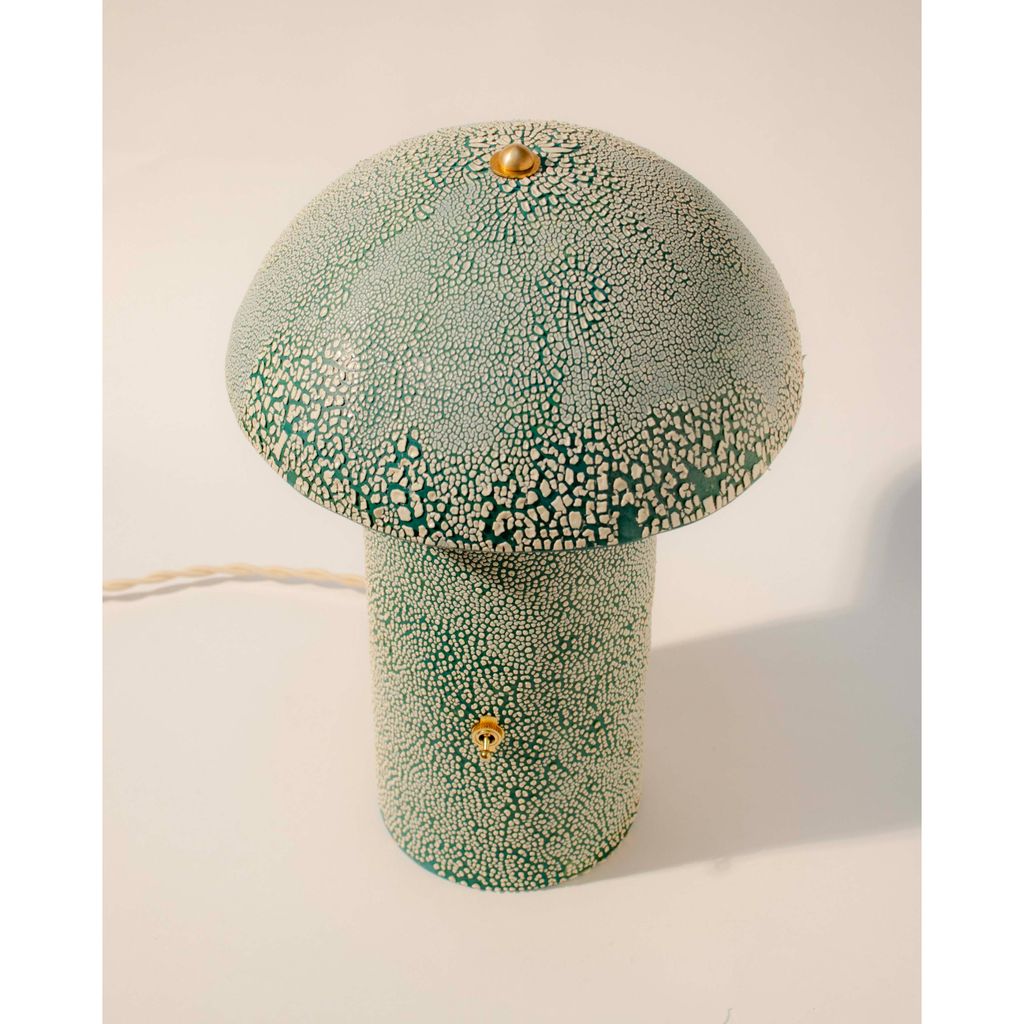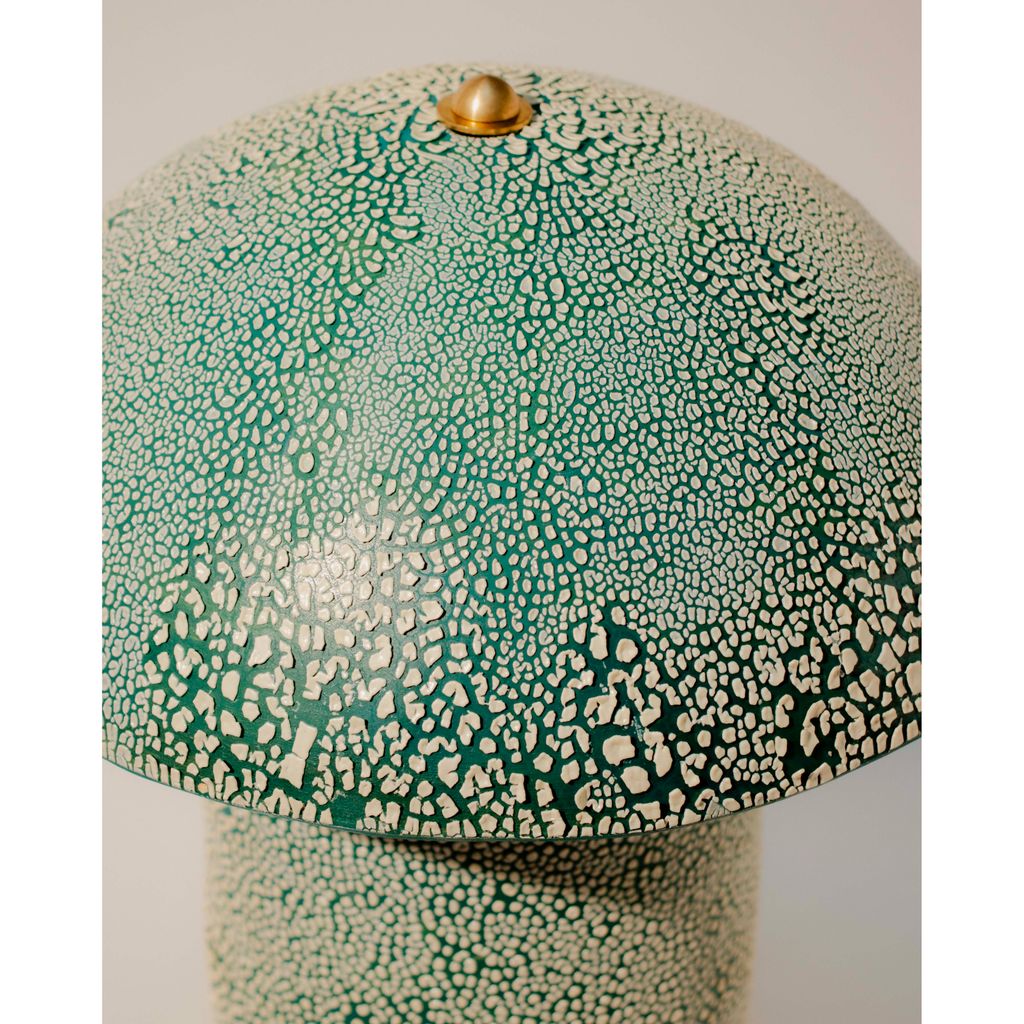 Every mushroom lamp is hand-made by Ethan Streicher, the founder and designer behind the Streicher Goods brand in Brooklyn, NY. The lamp's silhouette is simple and contemporary, featuring a tall cylindrical base that seamlessly transitions into a domed ceramic shade. Both the base and the shade are adorned with a textural glaze that lets the undercoated color come through as an accent.
