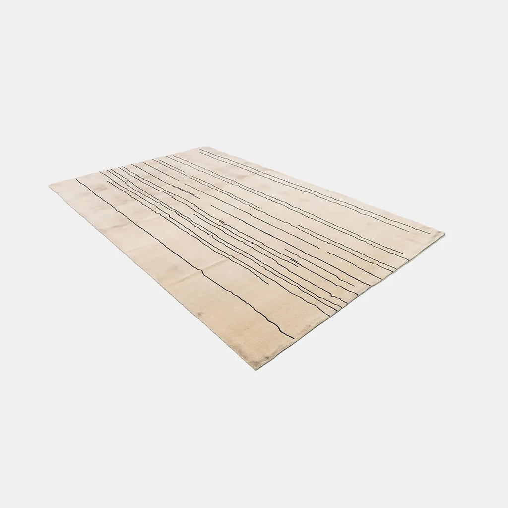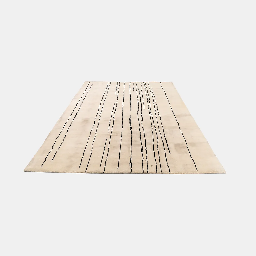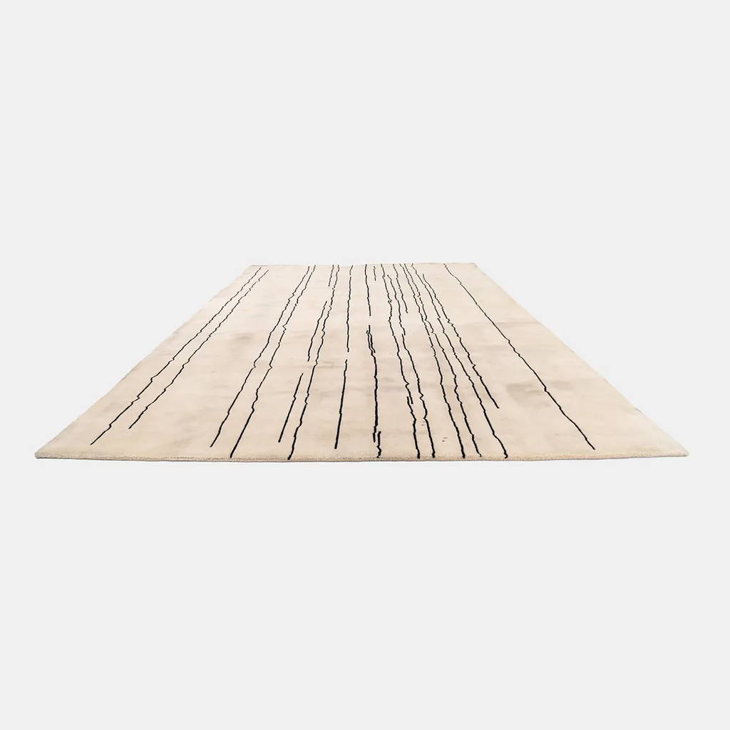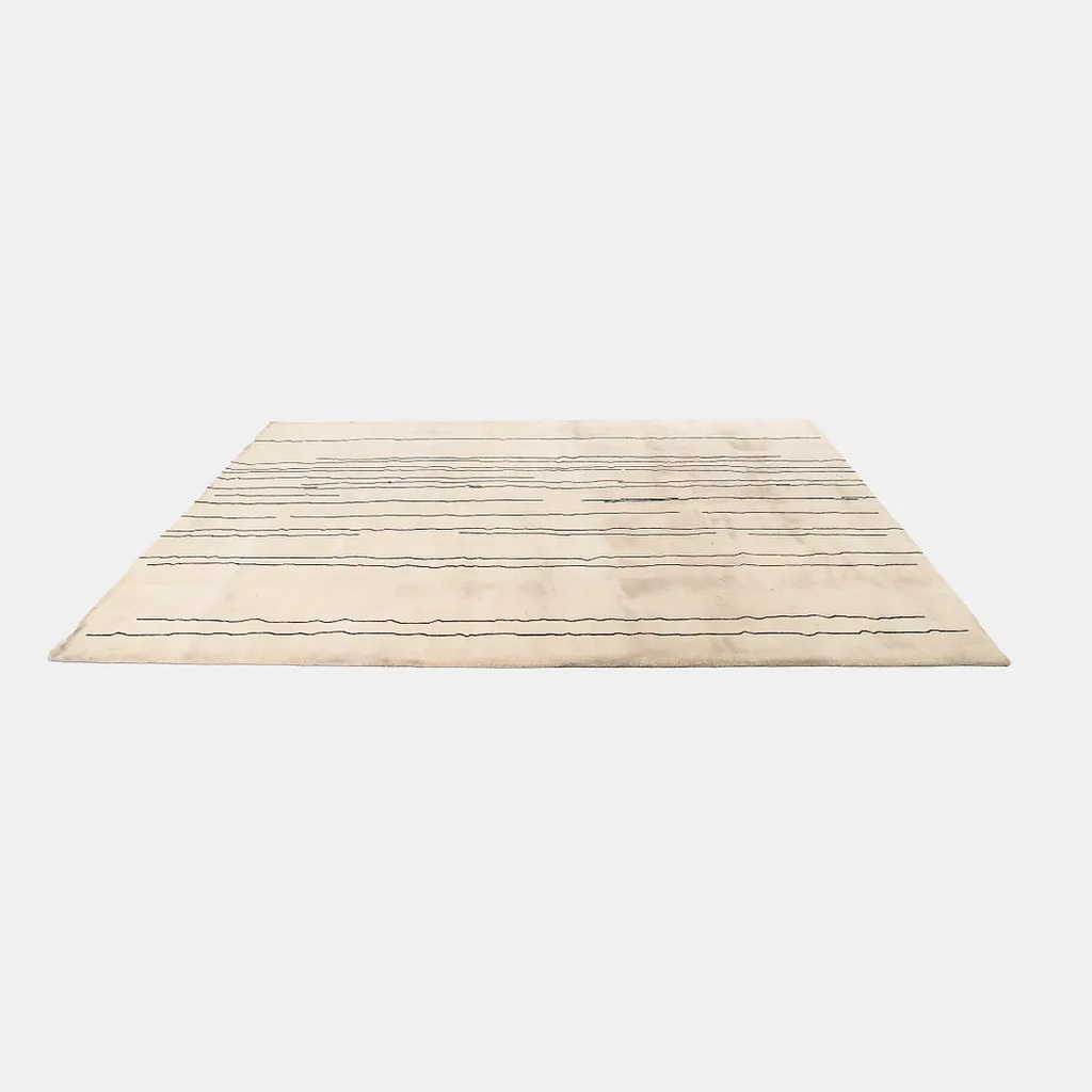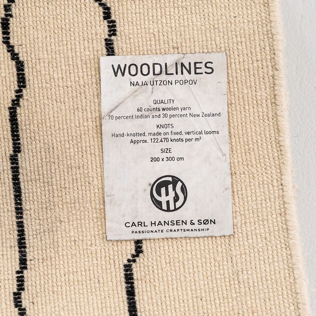 This is a Woodlines area rug, designed by Naja Utzom Popov and produced by Carl Hansen in Denmark. The piece is made of hand-knotted woolen yarn in cream, and it has contrasting black lines. The rug dates to circa 2021 and is guaranteed as authentic. The condition is very good with light wear from use, please see photos. This came directly from Carl Hansen and was seemingly used as a showroom display model or floor model.