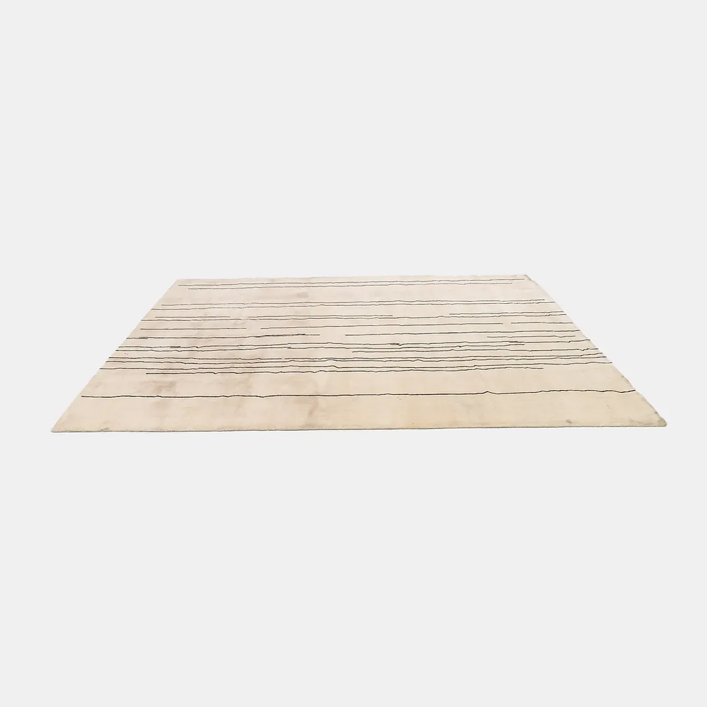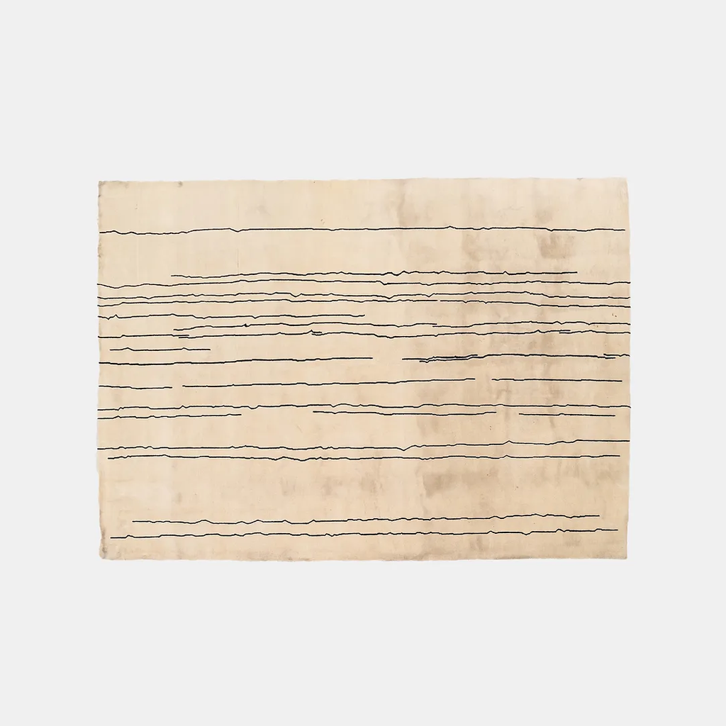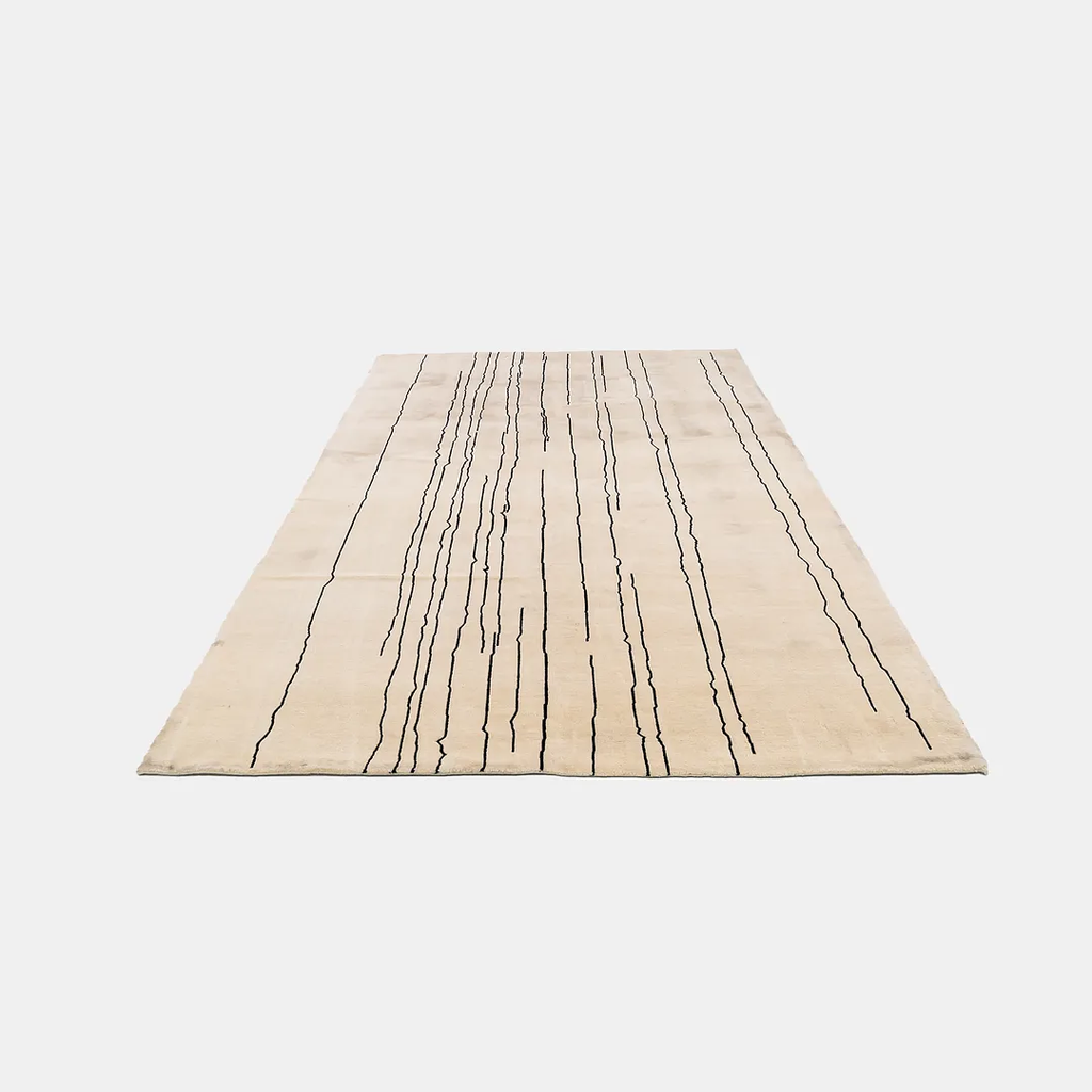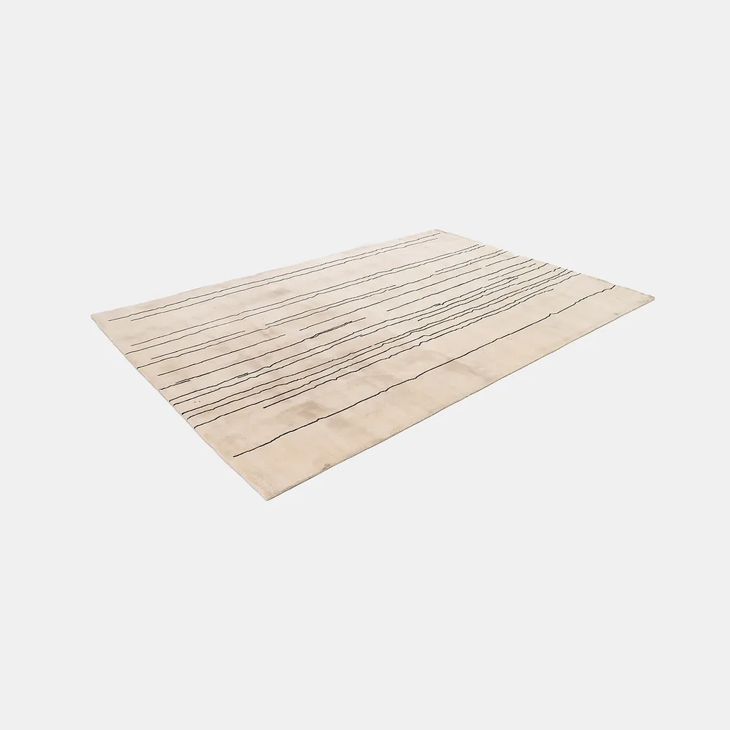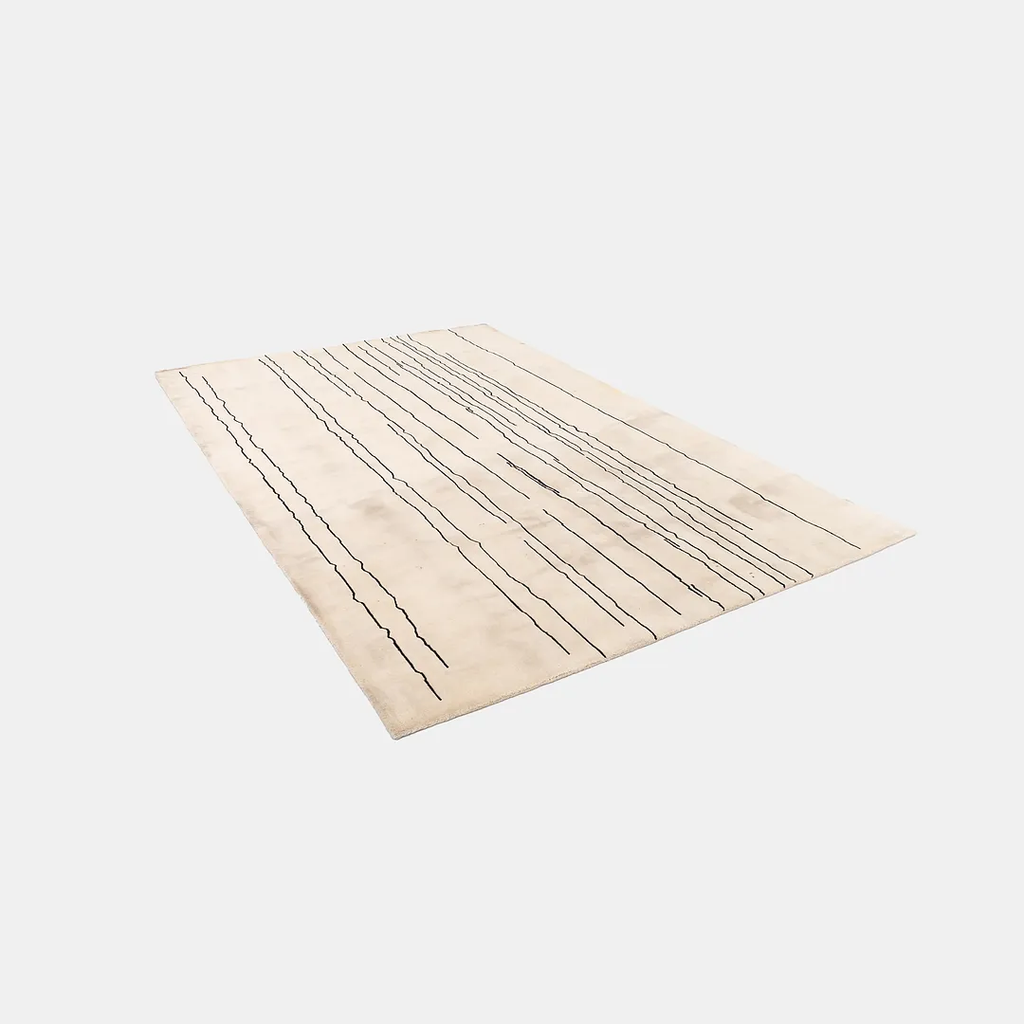 This is a Woodlines area rug, designed by Naja Utzom Popov and produced by Carl Hansen in Denmark. The piece is made of hand-knotted woolen yarn in cream, and it has contrasting black lines. The rug dates to circa 2021 and is guaranteed as authentic. The condition is very good with light wear from use, please see photos. This came directly from Carl Hansen and was seemingly used as a showroom display model or floor model.
