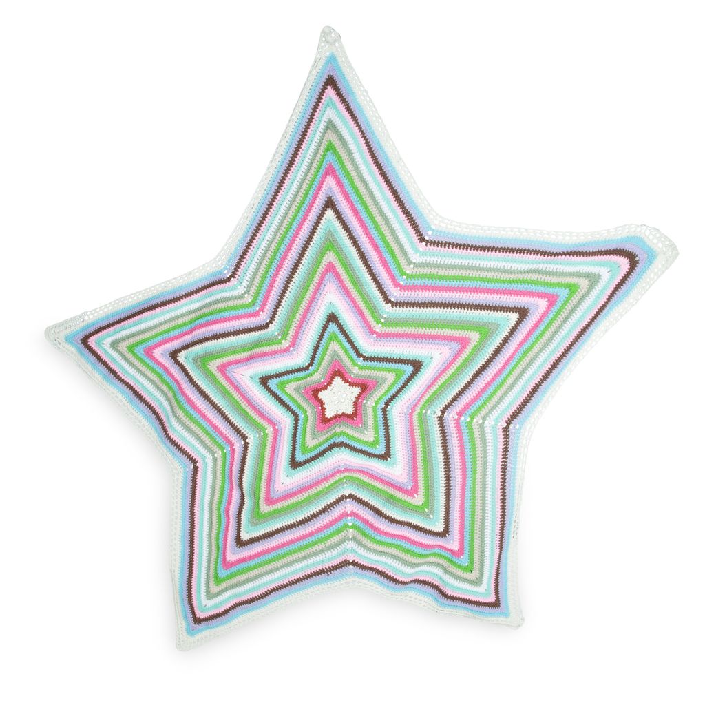Crochet Blanket 02 features star design with yellow center and brighter colors. Machine washable on a gentle cycle and dry on a low and slow setting.