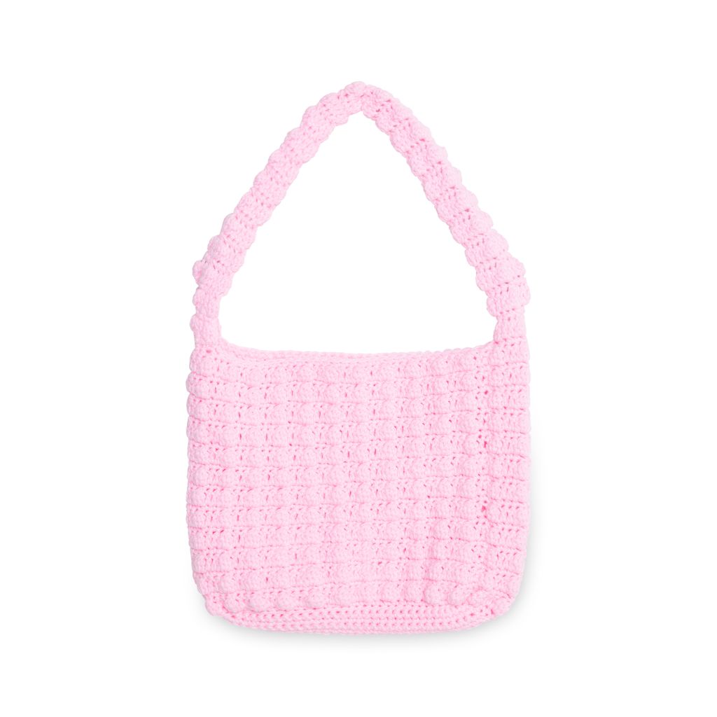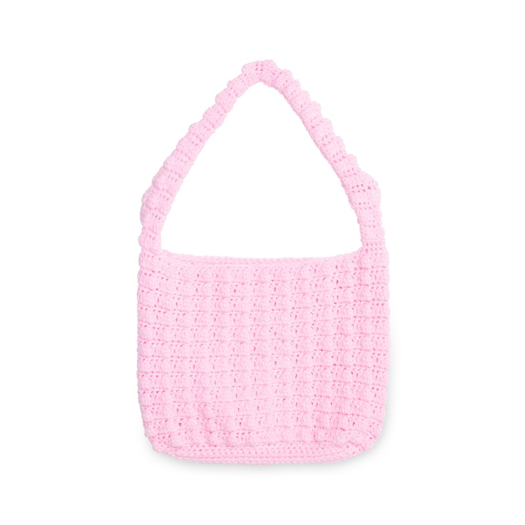 Crochet Tote 01 features baby pink bubble crochet, thick shoulder strap, and fits a laptop and all essentials. 100% cotton and machine washable.
