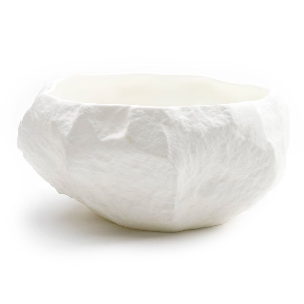 A collection of fine bone china tableware slip-cast from plaster models carved by hand, with glazed interior for functionality and raw exterior reflecting the modest surface texture of the plaster original. The process of slip-casting begins with the creation of a three- dimensional model of the design known as a master by a professional model-maker, from which the production mould is cast. Crockery bypasses this process by placing the responsibility of both designer and model-maker in the hands of Max Lamb. Using the tools of a stone mason Max chips and carves a solid block of plaster to make a series of tableware, the design of each formed quite simply out of their own making.