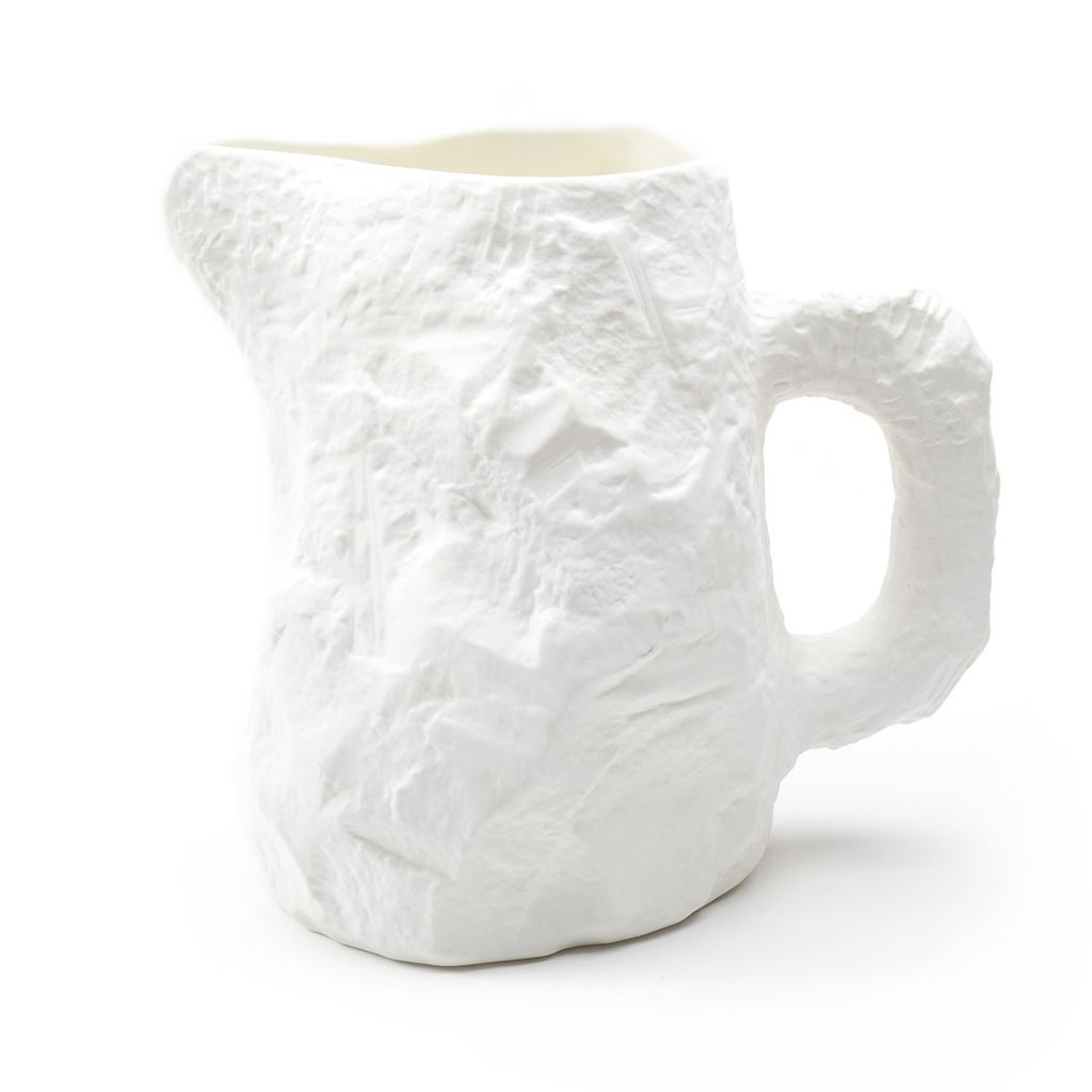 A collection of fine bone china tableware slip-cast from plaster models carved by hand, with glazed interior for functionality and raw exterior reflecting the modest surface texture of the plaster original. The process of slip-casting begins with the creation of a three- dimensional model of the design known as a master by a professional model-maker, from which the production mould is cast. Crockery bypasses this process by placing the responsibility of both designer and model-maker in the hands of Max Lamb. Using the tools of a stone mason Max chips and carves a solid block of plaster to make a series of tableware, the design of each formed quite simply out of their own making.