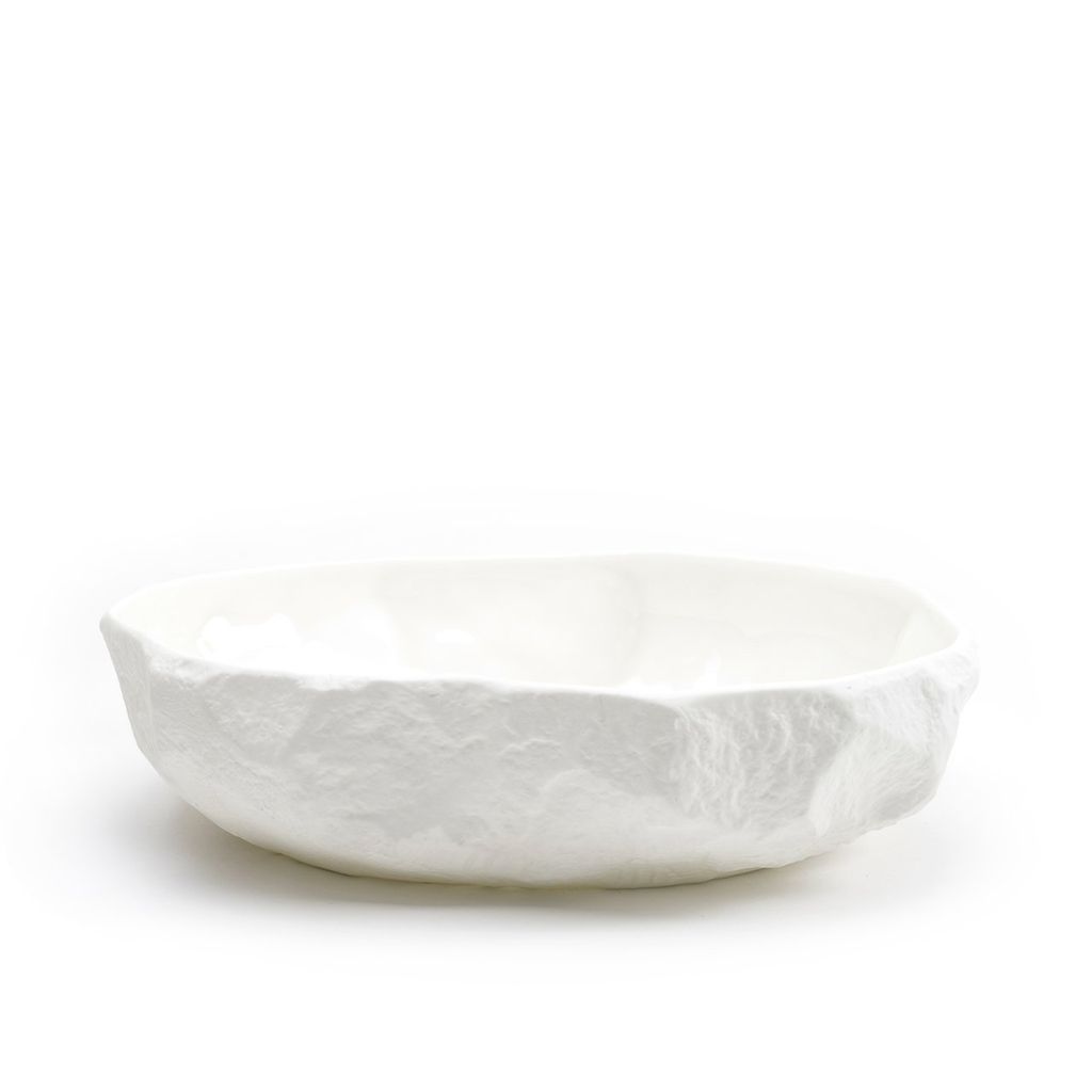 A collection of fine bone china tableware slip-cast from plaster models carved by hand, with glazed interior for functionality and raw exterior reflecting the modest surface texture of the plaster original. The process of slip-casting begins with the creation of a three- dimensional model of the design known as a master by a professional model-maker, from which the production mould is cast. Crockery bypasses this process by placing the responsibility of both designer and model-maker in the hands of Max Lamb. Using the tools of a stone mason Max chips and carves a solid block of plaster to make a series of tableware, the design of each formed quite simply out of their own making.