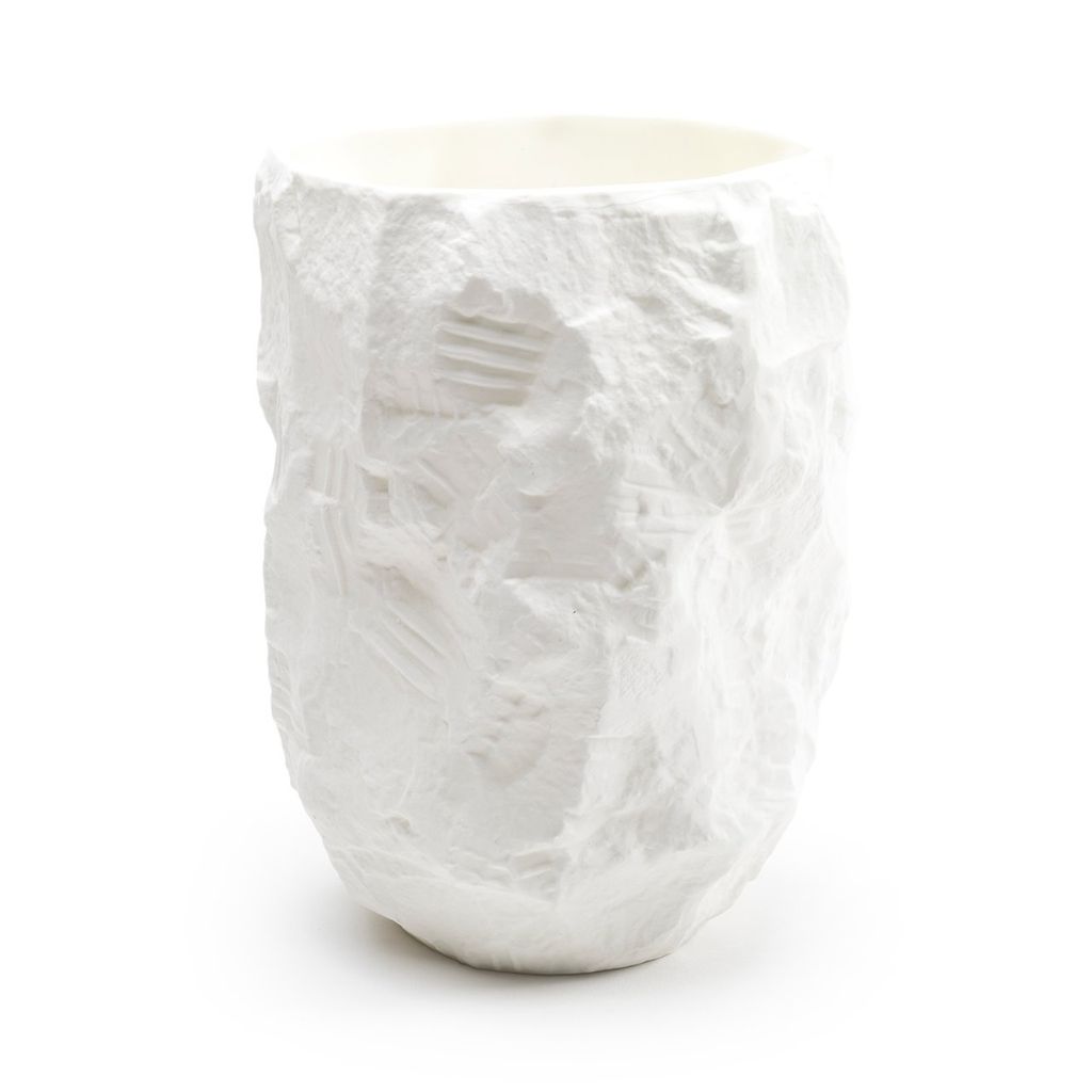 A collection of fine bone china tableware slip-cast from plaster models carved by hand, with glazed interior for functionality and raw exterior reflecting the modest surface texture of the plaster original. The process of slip-casting begins with the creation of a three- dimensional model of the design known as a master by a professional model-maker, from which the production mould is cast. Crockery bypasses this process by placing the responsibility of both designer and model-maker in the hands of Max Lamb. Using the tools of a stone mason Max chips and carves a solid block of plaster to make a series of tableware, the design of each formed quite simply out of their own making.
