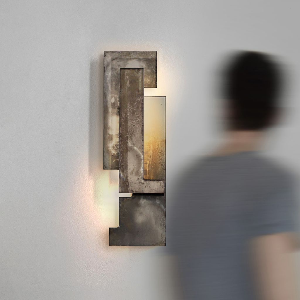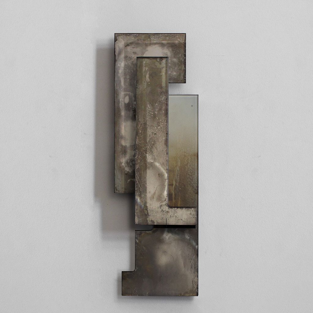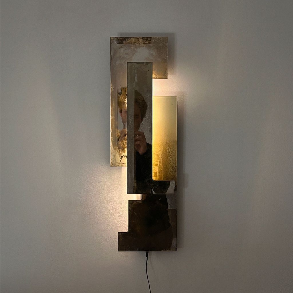 Hand-silvered wall lighting object. Series of unique works. Each lighting object, composed of glass elements, is treated with Boldizar Senteski's signature silvering technique. These fragments are assembled into a singular whole, their surfaces hand-silvered and alloyed.