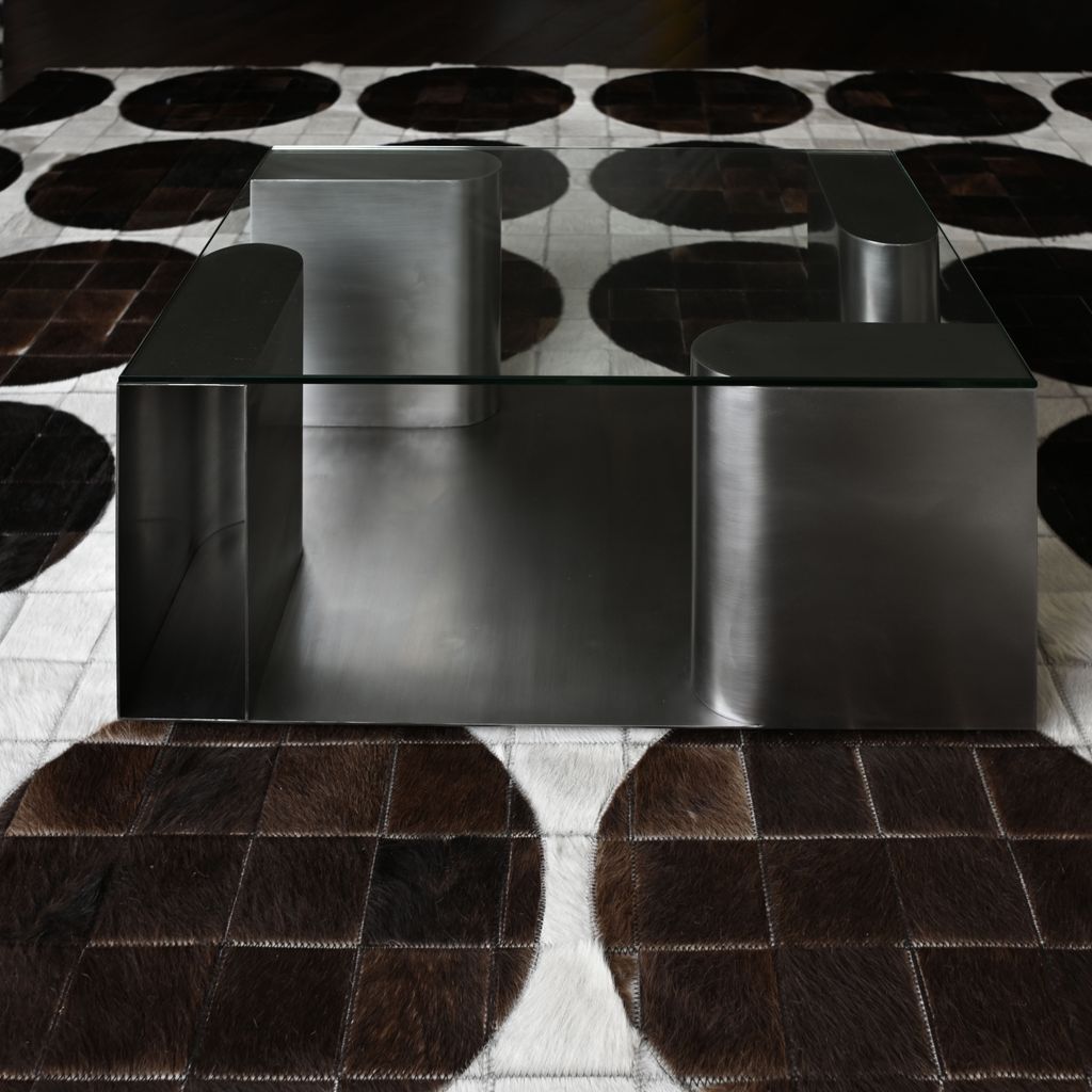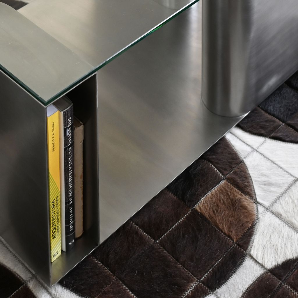 This coffee table features a base made entirely of stainless steel, with each leg functioning as an open compartment for storing books. A tempered glass top rests above, offering a clear view of the sculptural metal structure beneath. The space between the compartments serves as an additional display surface—ideal for showcasing objects, books, or decorative elements—while the transparency of the glass highlights the table’s layered utility and material contrast.