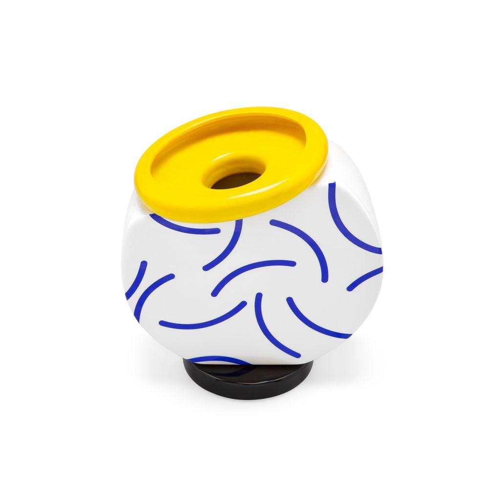 Cucumber is an eccentric ceramic vase designed by Martine Bedin in 1985. The chubby, asymmetrical form is enhanced by the lively combination of colors and the original decorative motif, with curved blue lines on the white surface. The rounded shape, linking back to the name, rests on a black cylindrical base and is cut diagonally at the top by a bright yellow ring.