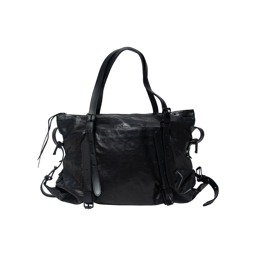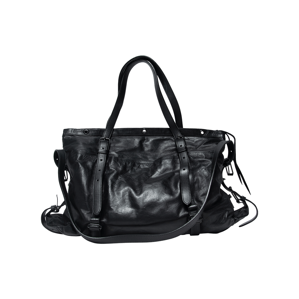 Custom Patrick Stephan Leather Bag features shoulder and crossbody straps with adjustable hardware, leather exterior, and a printed multi pocket interior.