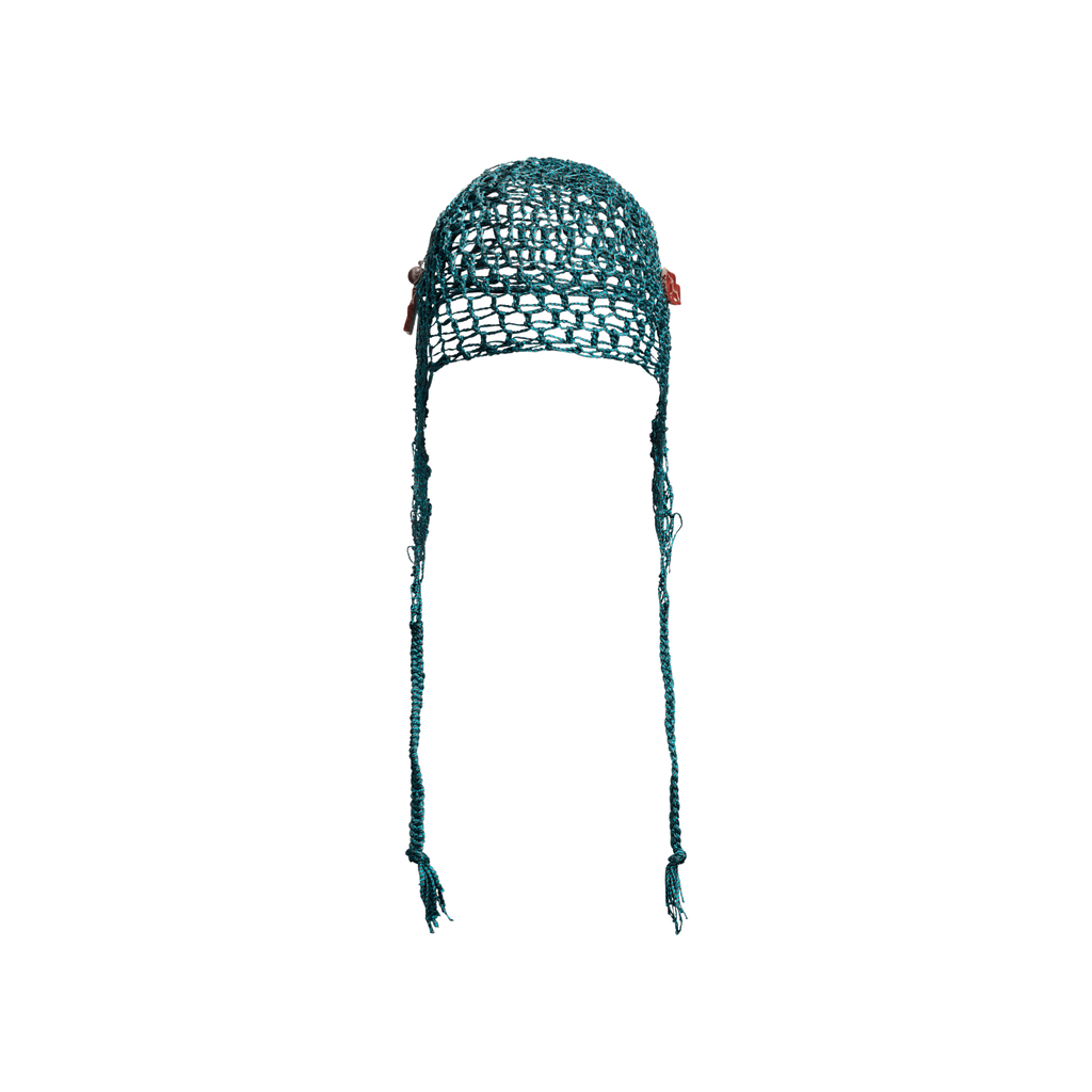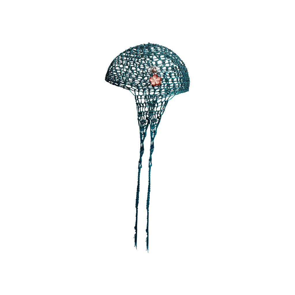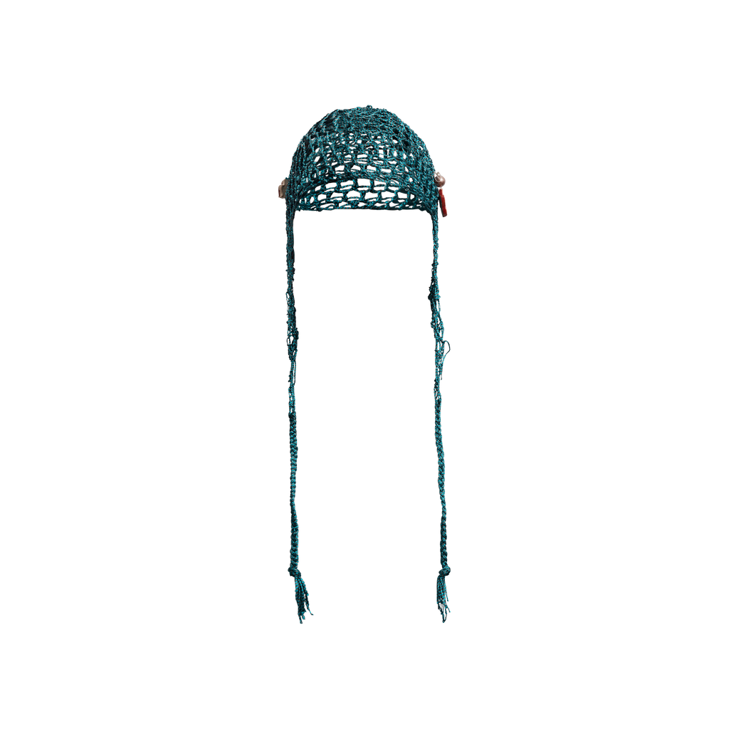Deep sea turquoise fishnet balaclava with a red lip ceramic charm and a vintage pearl ceramic flower amulet.