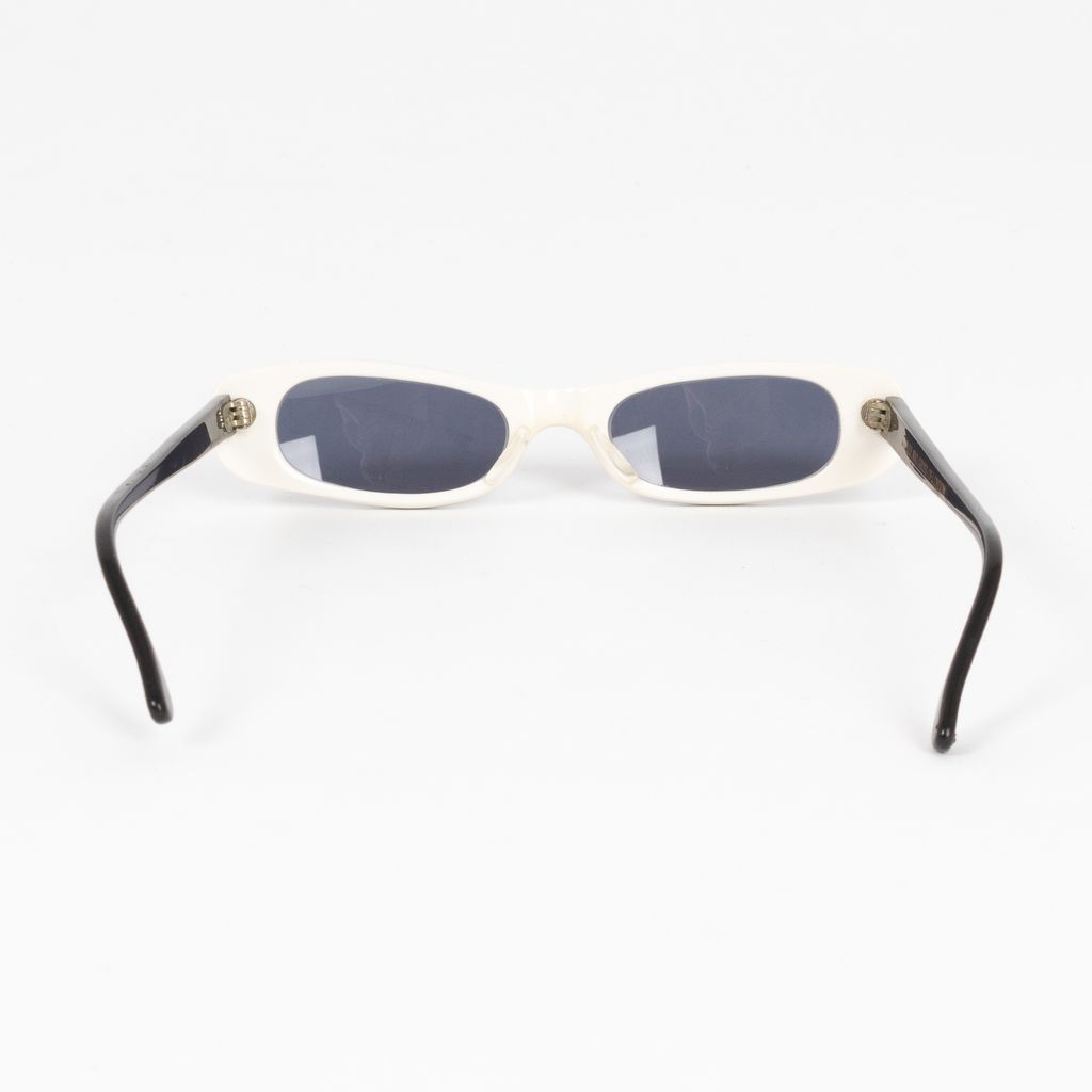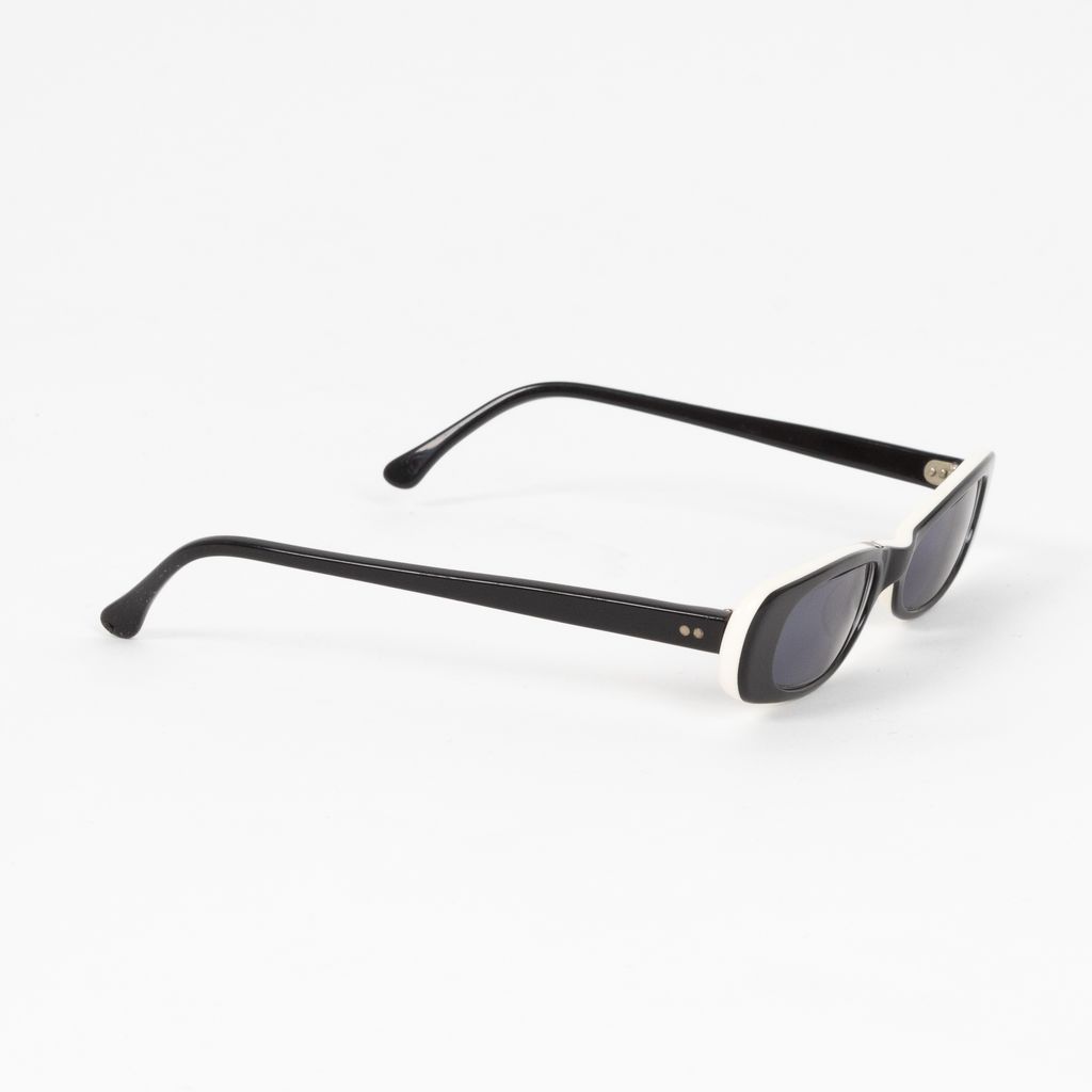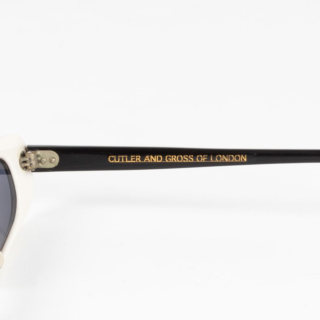 Call all 90's girls, these super skinny sunglasses from Cutler and Gross are the frames for you. Features squoval shaped lens frame, black acetate body with white trim, Cutler and Gross branding on interior of arm, and smoke colored lenses.