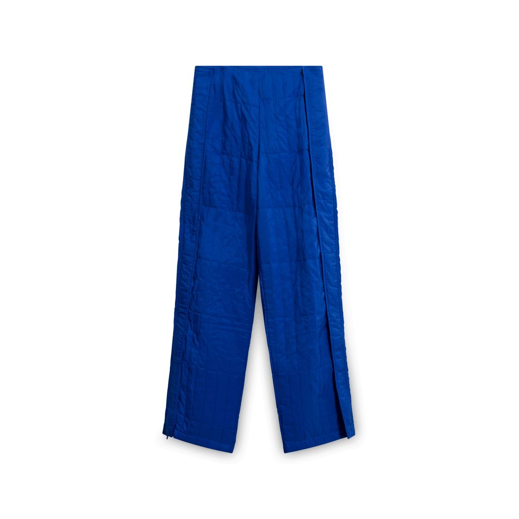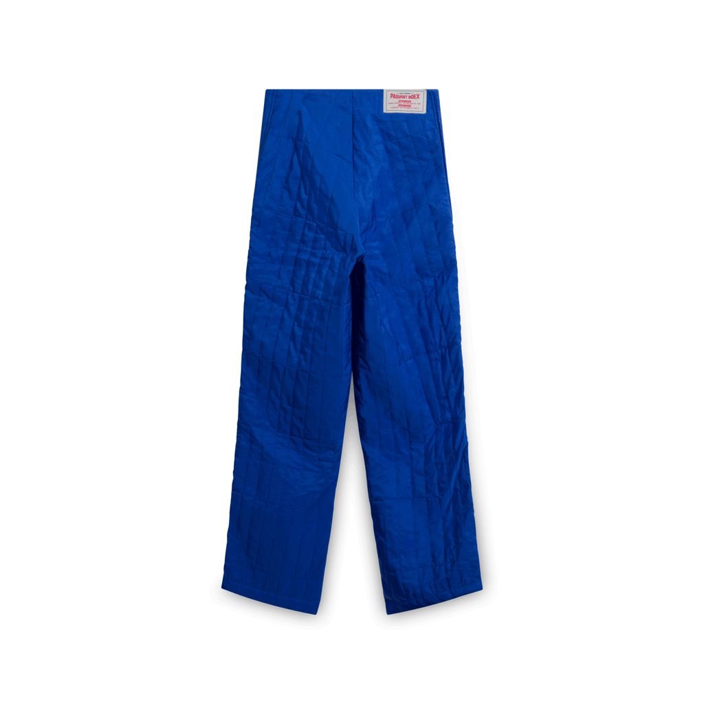 Blue padded pants with two side zipper closures hidden behind snap buttons.